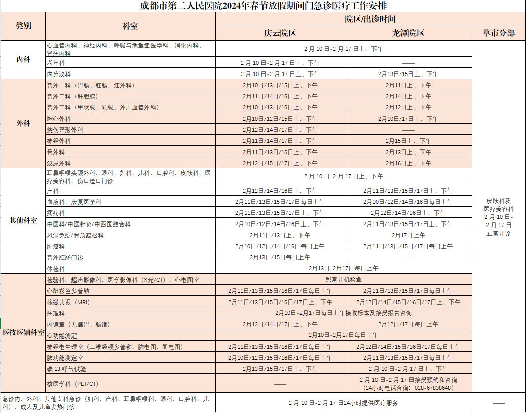 (1)院本部、皮肤病性病研究所、东院(龙泉院区)、精神医学中心(温江院区)门诊2月10日—2月12日(大年初一至大年初三)休息;2月13日—2月17日(大年初四至大年初八)开诊。2月4日按周四排班,2月18日按周五排班。