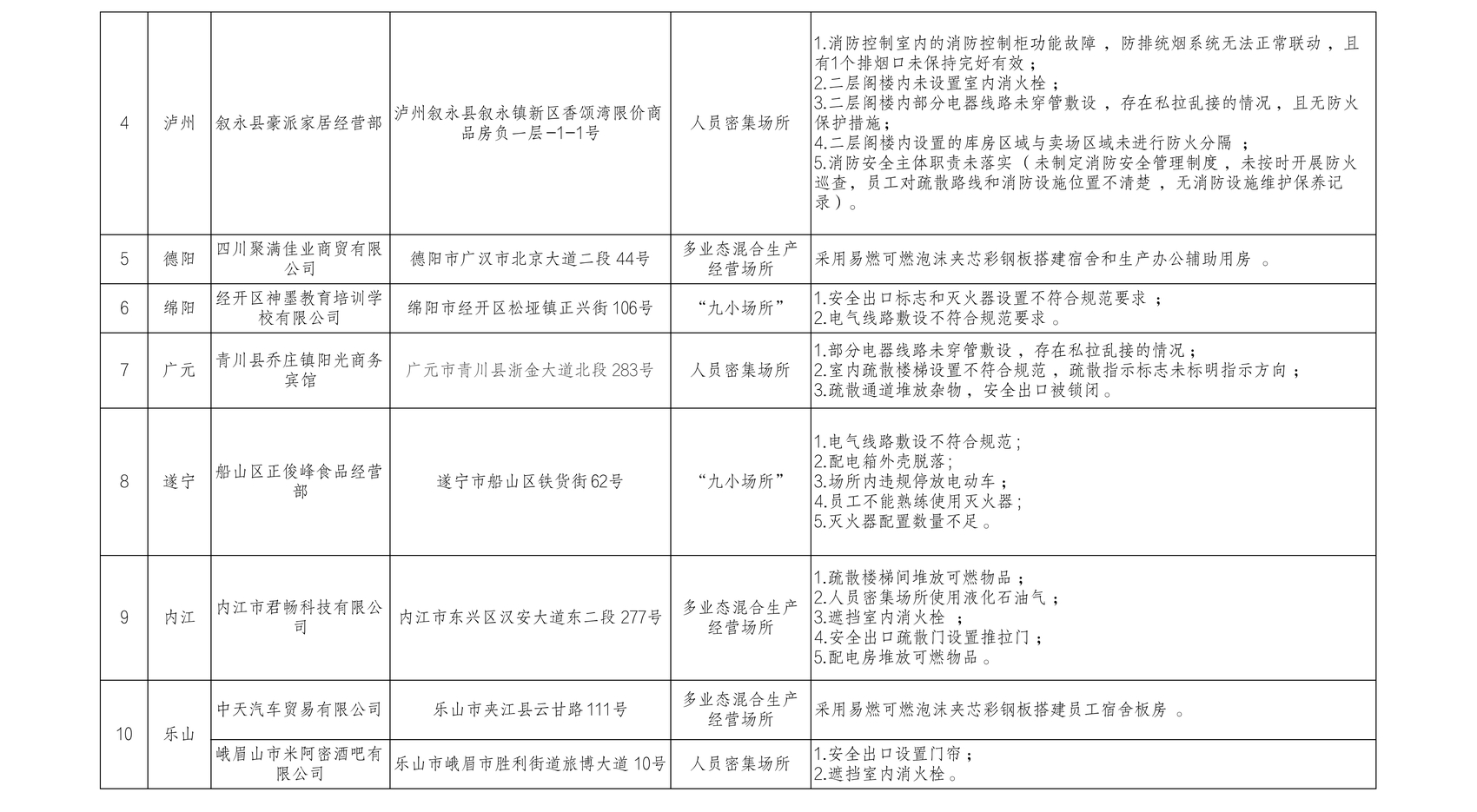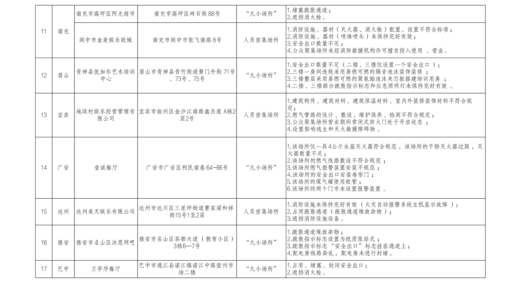 值得注意的是,安全疏散通道被堵占的情况五花八门。成都市龙泉驿区一教育培训机构安全疏散出口不具备疏散条件,安全疏散指示标识也不符合规定;广安市壹诚餐厅安全出口安装卷帘门;广元市青川县乔庄镇阳光商务宾馆在疏散通道堆放杂物,安全出口被锁闭……