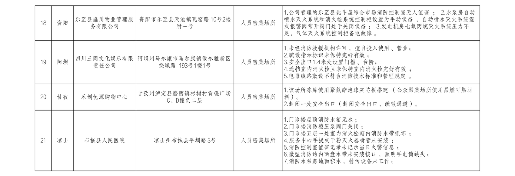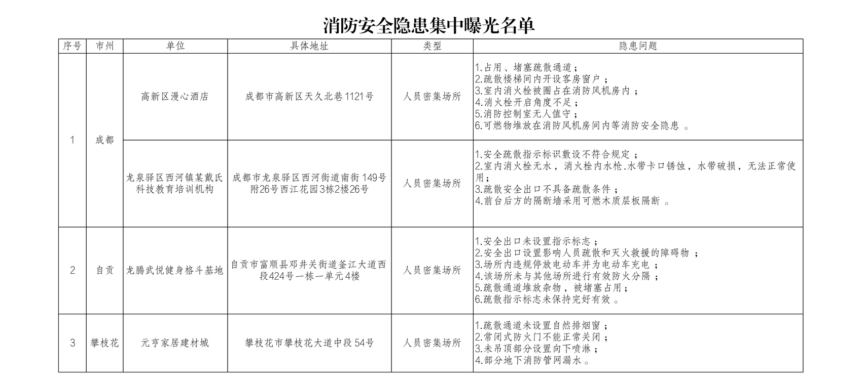 2月7日,川观新闻记者从四川省消防救援总队获悉,连日来,全省各级消防部门深入推进消防安全集中除患攻坚大整治行动,联合当地政府、各行业部门全面排查整治各类消防安全隐患。针对检查中发现的典型隐患和消防安全违法行为,四川省消防救援总队对24家单位进行集中曝光,督促相关单位和责任人加以警醒,及时整改消除隐患。