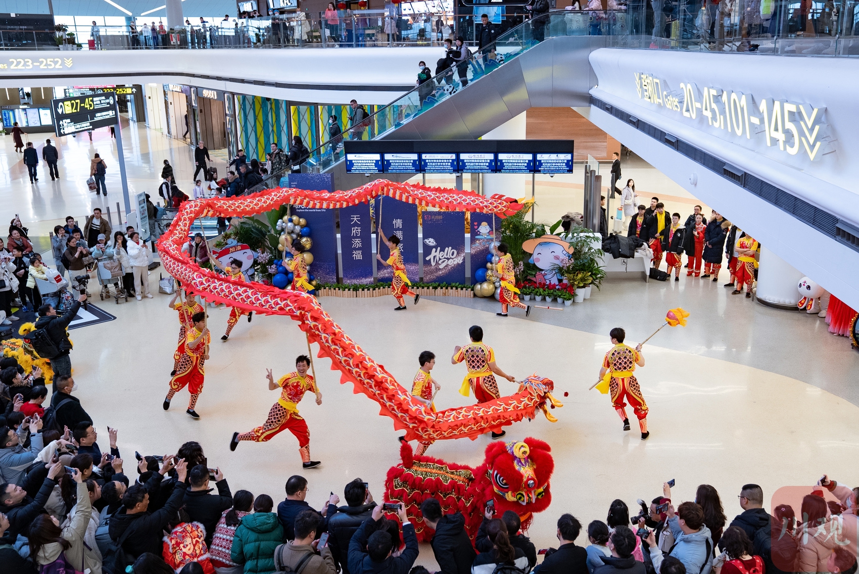 2月7日,成都天府国际机场航站楼里面正在进行舞龙表演,吸引大量旅客围观。