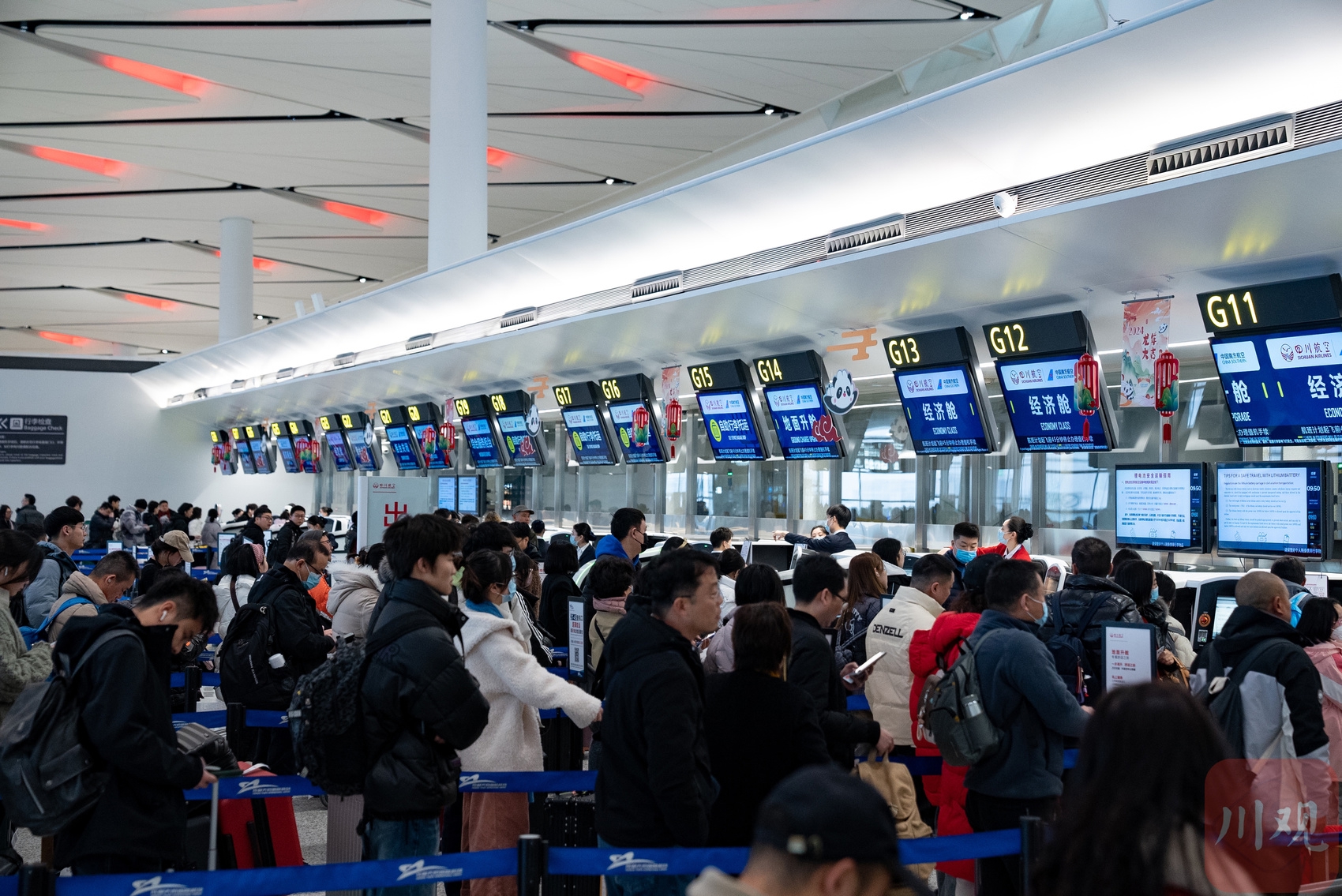 2月7日,成都天府国际机场T2航站楼出发大厅,旅客正在排队办理值机。