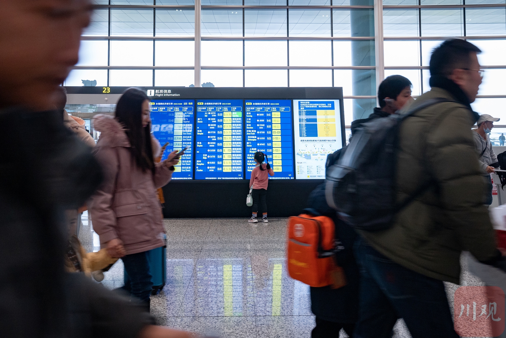 2月7日,成都天府国际机场T2航站楼出发大厅,步履匆匆的旅客。