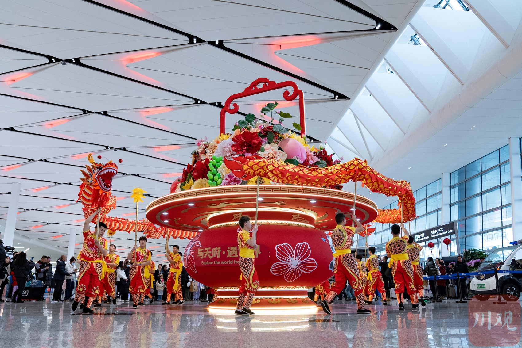 2月7日,成都天府国际机场航站楼里面正在进行舞龙表演。