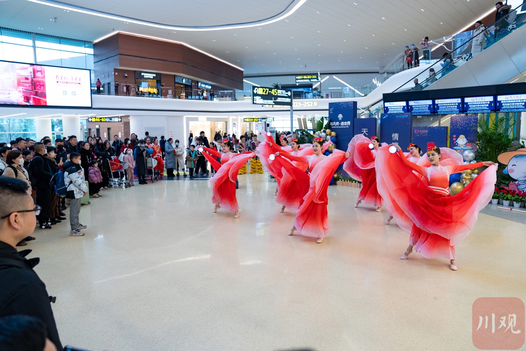 2月7日,成都天府国际机场航站楼里面正在进行舞蹈表演。