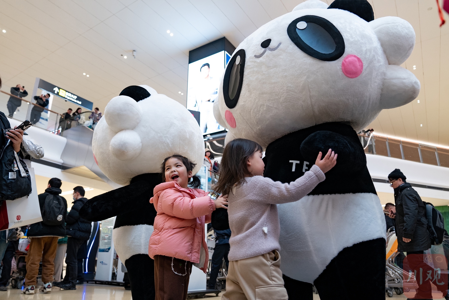 2月7日,成都天府国际机场T2航站楼内,小女孩在拥抱熊猫人偶。