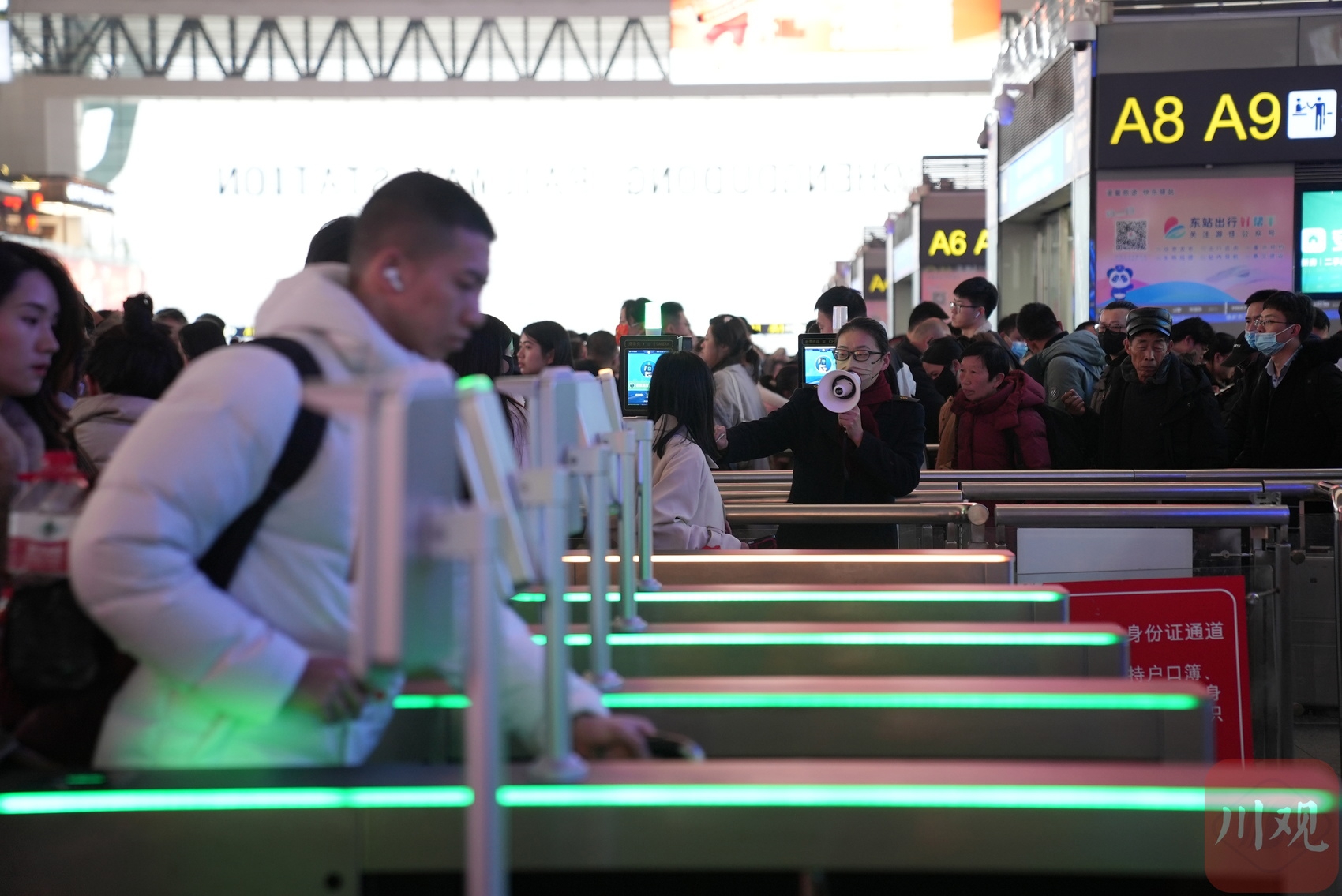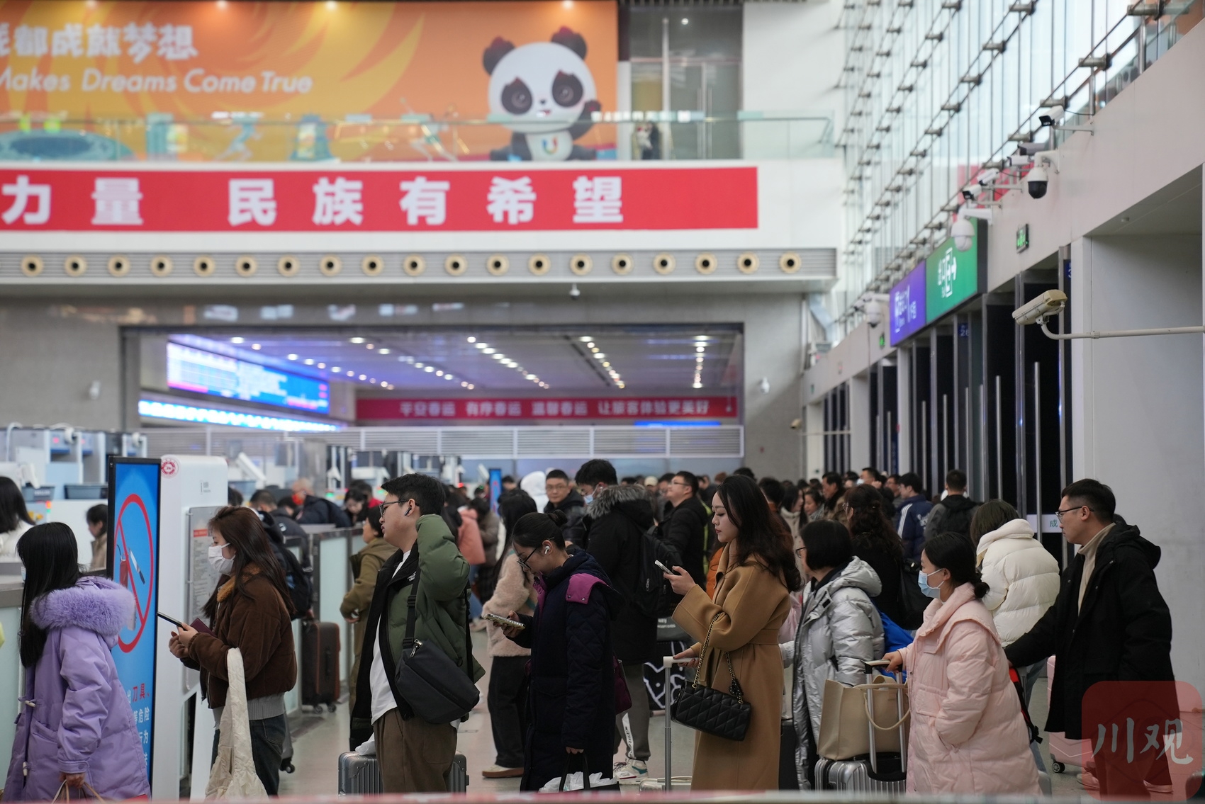 大批旅客通过安检进入成都东站站厅候车