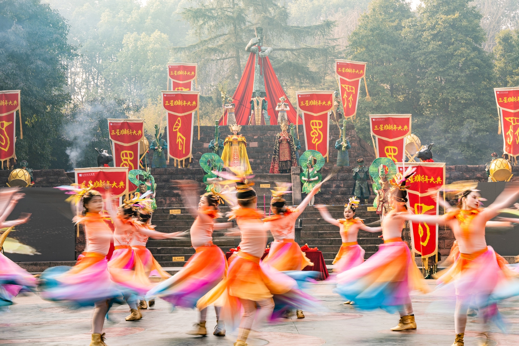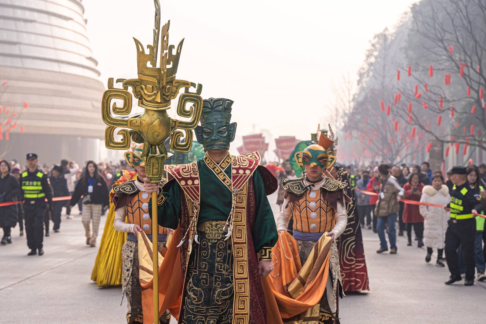 今年的新年大典以“三星堆里过大年 古蜀圣地祈新福”为主题,分为祈神出征、迎神奉神和祭祀盛典三大部分,通过祭祀巡游、礼乐歌舞的表现形式,将古代祭祀场景与古蜀文化相结合,再现了传统祭祀礼仪盛况。
