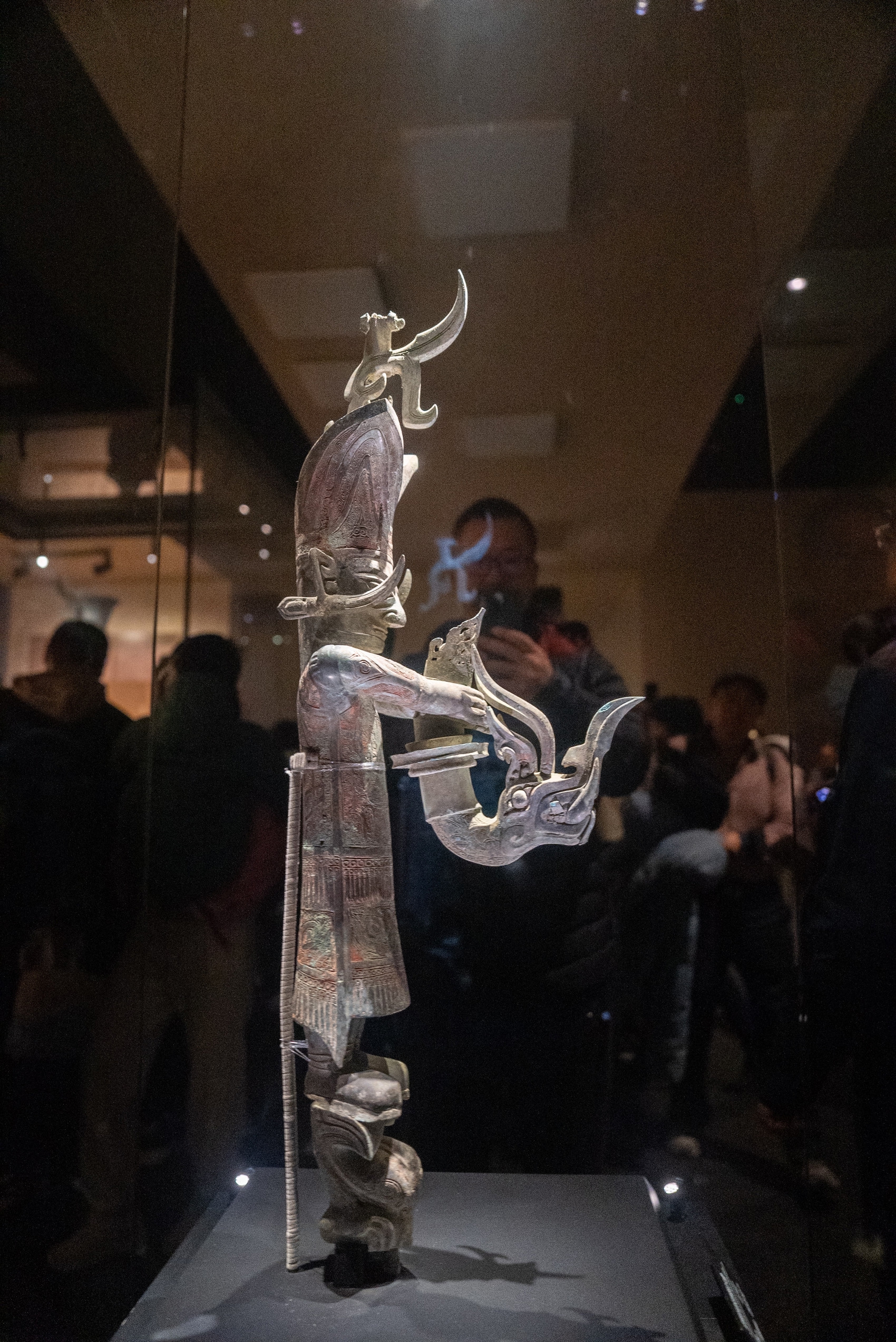 不过,在三星堆中寻“龙意”,最具代表性的当属博物馆中展品上那些造型各异的龙——盘踞在青铜神树一侧的“神龙”、鸟足神像顶端青铜立人手握的“龙杖”,还有青铜大立人衣角上的“龙纹”……行走在三星堆博物馆新馆内,每一件与龙相关的展品几乎都围绕着层层“人墙”。