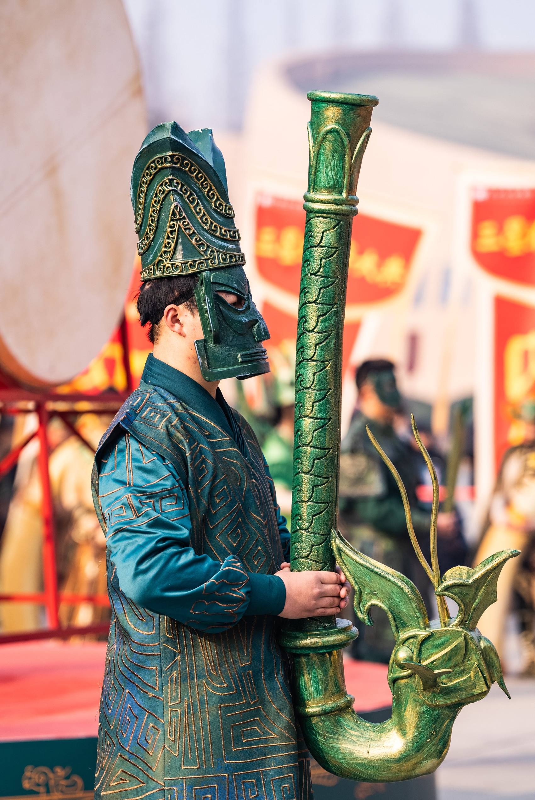 号角悠远,鼓点紧密。2月10日上午9点30分,百余名演员在头戴青铜面具,手拿古蜀权杖的“大祭司”带领下手持仪仗,分列两侧——2024三星堆新年大典即将开始。