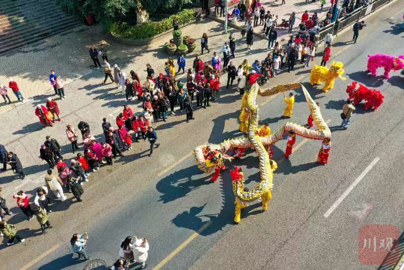 “龙砌塔”“龙抱柱”……“雨坛彩龙”前行时,形态变化多姿。在冬日暖阳的照耀下,把“雨坛彩龙”衬得更加精神抖擞,一举一动都透出“新年新气象”的“年味”。