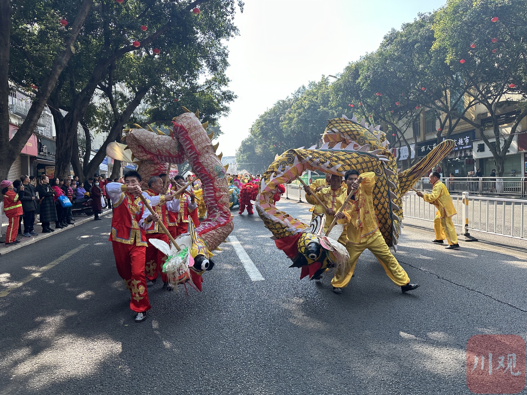 锣鼓喧天,龙珠随之跳动时发出“沙沙”声,一条黄色彩龙和一条红色彩龙伴其左右,两条彩龙时而追着龙珠舞动,相互争抢,驻足眨眼对望……2月10日,四川日报全媒体新春走基层采访小分队来到泸州市江阳区,感受国家级非物质文化遗产泸县“雨坛彩龙”在江阳区巡游的魅力。