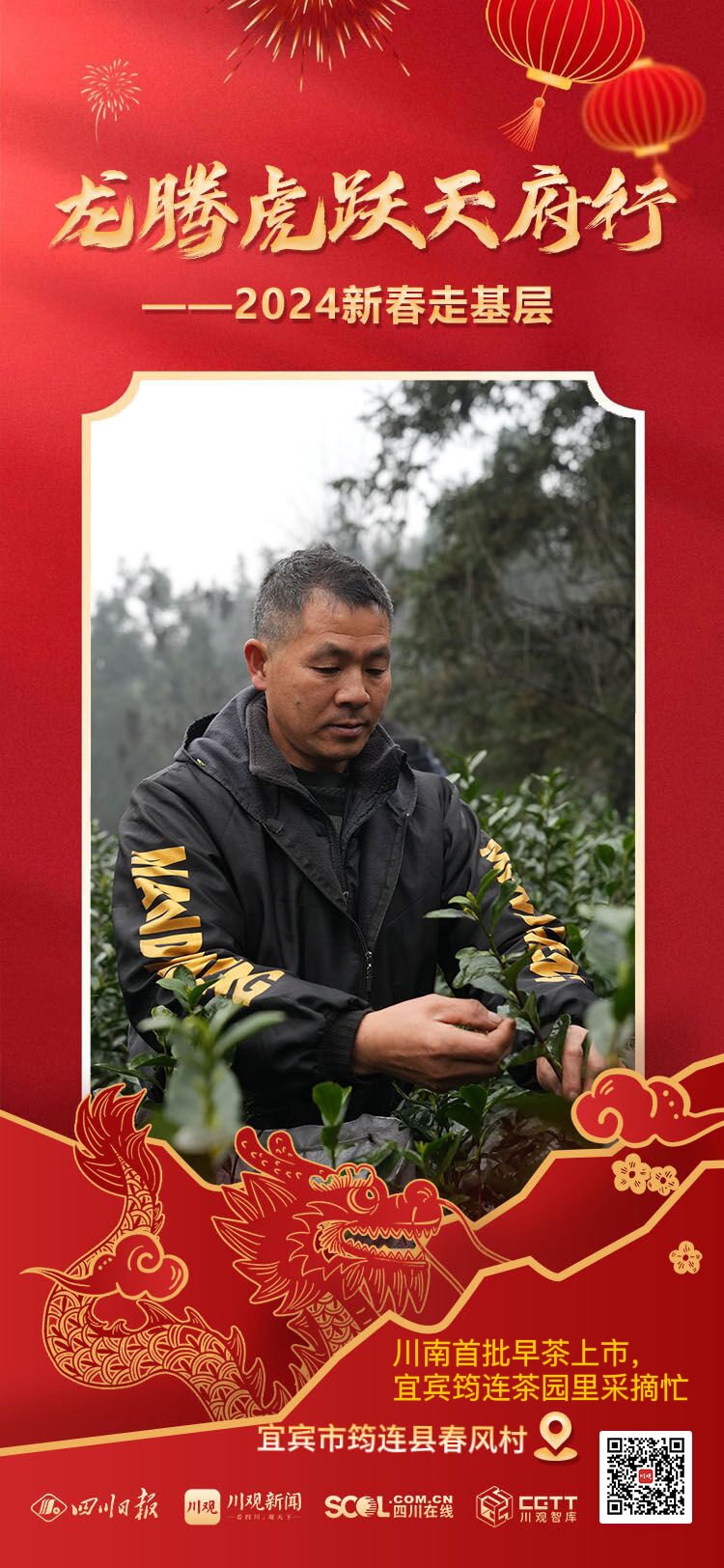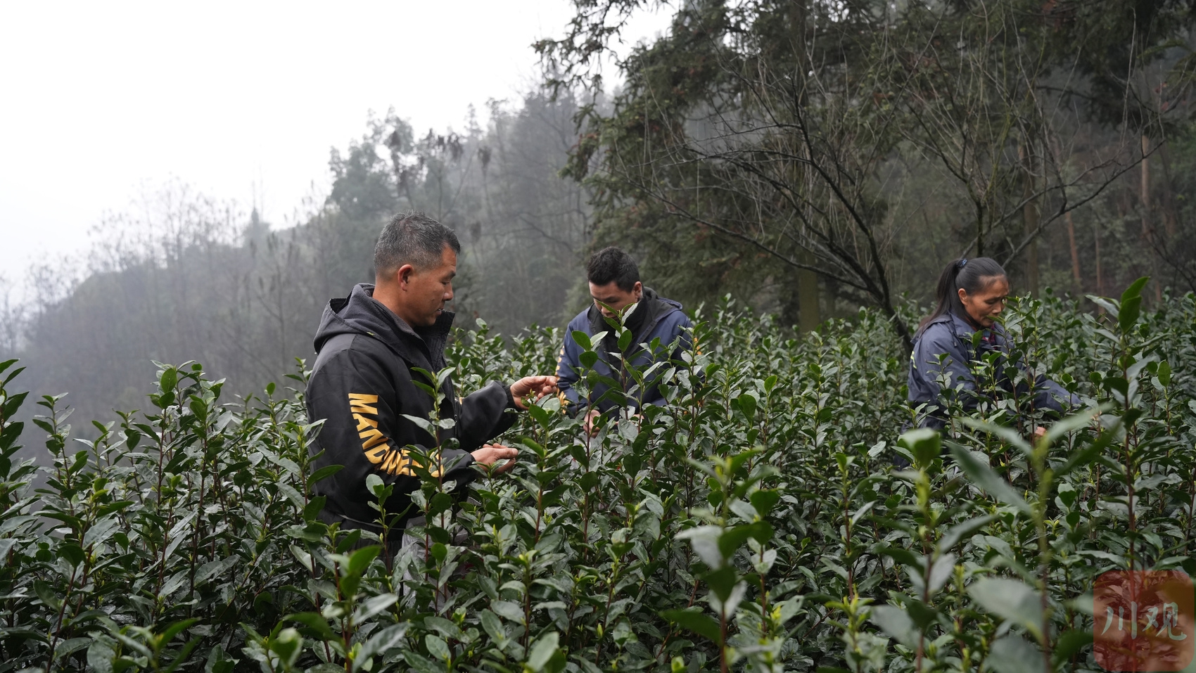 2月14日早晨8点半,川滇交界处的宜宾市筠连县腾达镇春风村16组,第一缕晨光还没照进山坳,村民谢正兵一家三口便带上口袋往茶园走去。茶树散发的清香混合着泥土的气息在山间弥漫,行走在齐胸高的茶树间,雨衣上沾满了昨夜的露珠,三人只有肩膀以上露出枝头,像是在绿色的海洋里游泳。