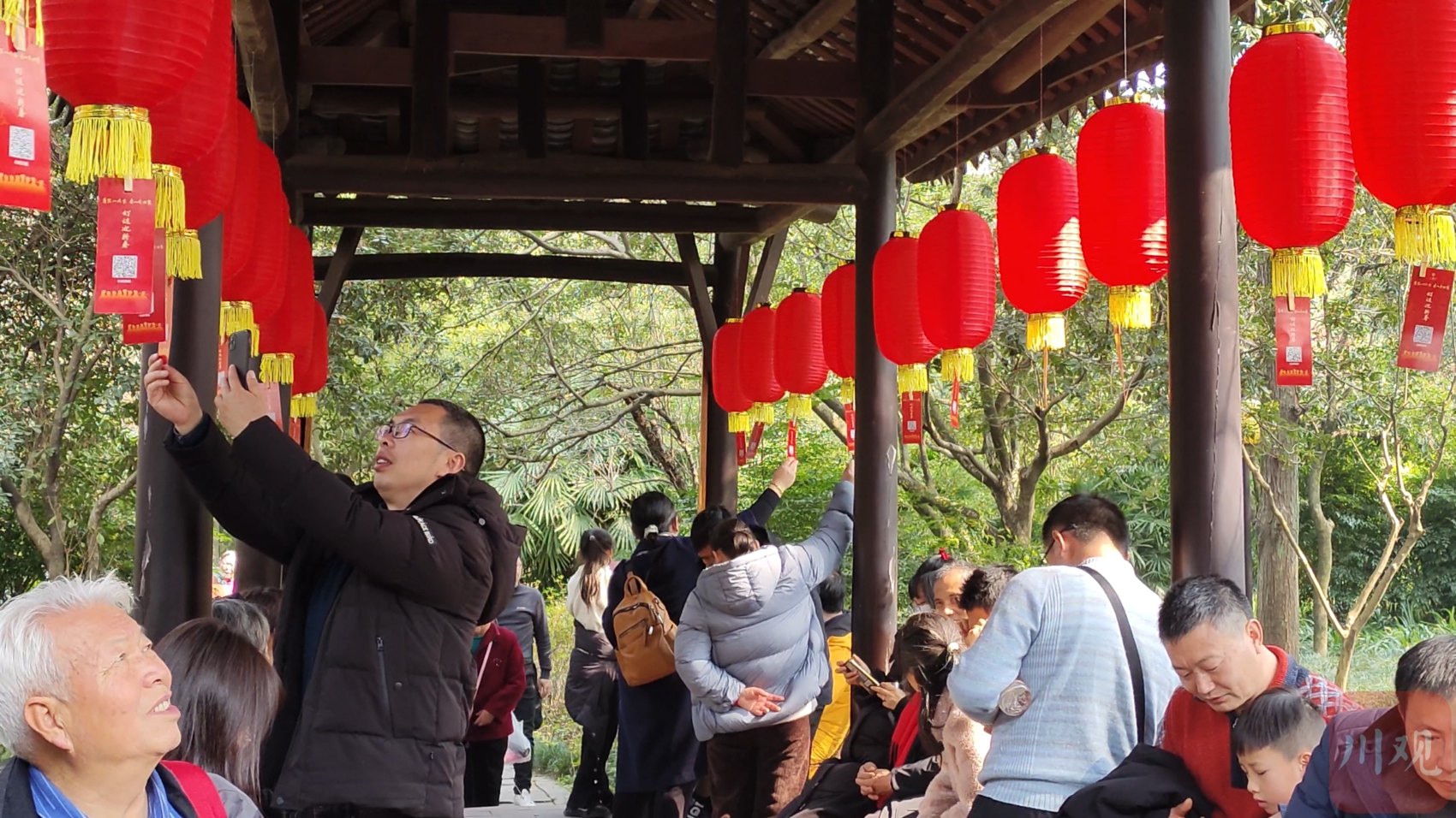 不远处的听荷轩,猜灯谜活动现场人头攒动。灯谜主题是围绕唐宋八大家的诗词,工作人员介绍,这个活动每天大概可以发奖300份,参与游戏的游客大多以家庭为单位参加,每天人数大概有3000人左右。