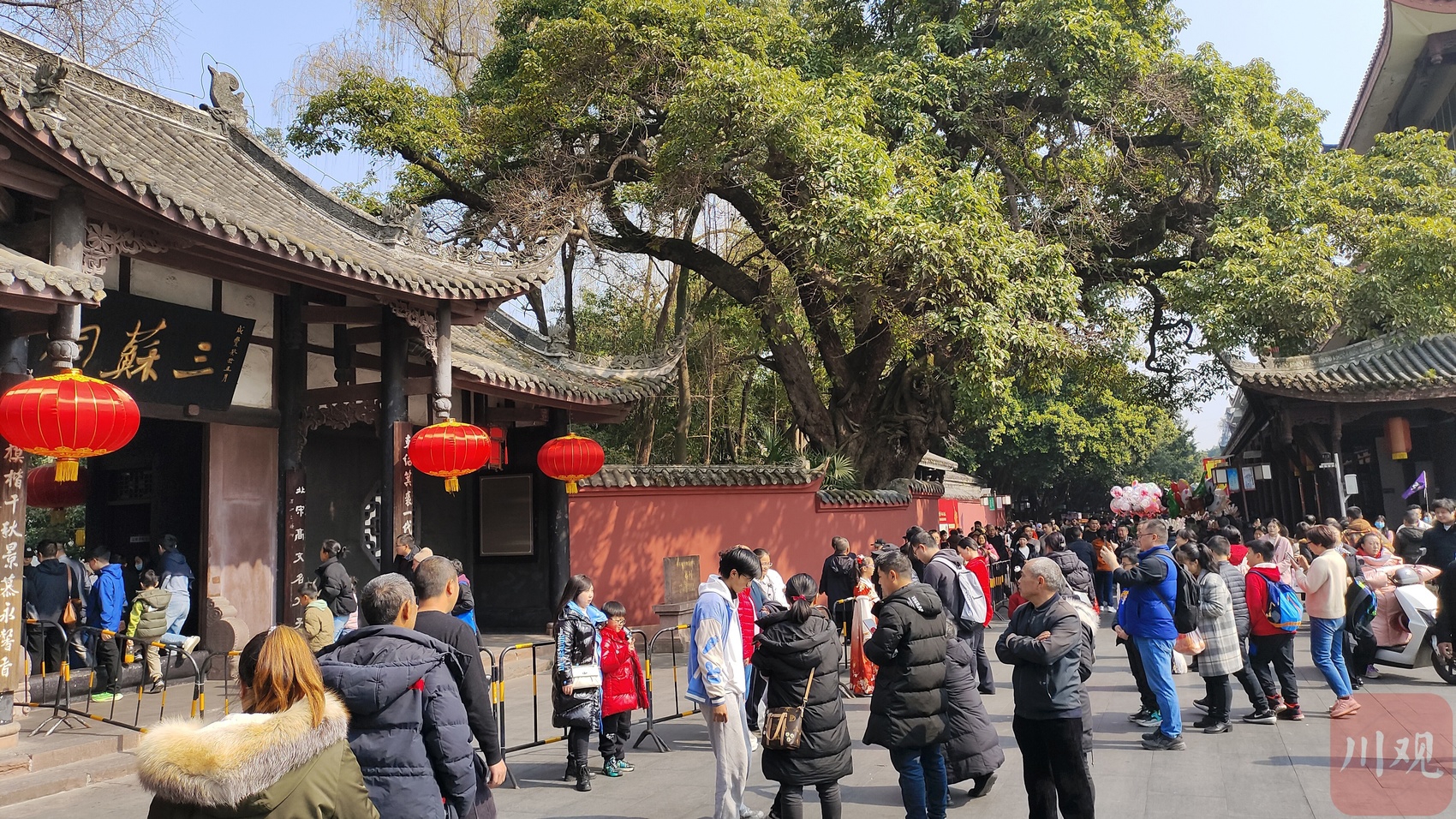 2月14日,大年初五。眉山市东坡区三苏祠大门外,红色灯笼高悬,年味十足。早上8时30分,不少游客已经在有序排队等待开门。三苏祠内,在这里工作了18年的金牌讲解员郑小利早已就位,整理妆造、检查设备。