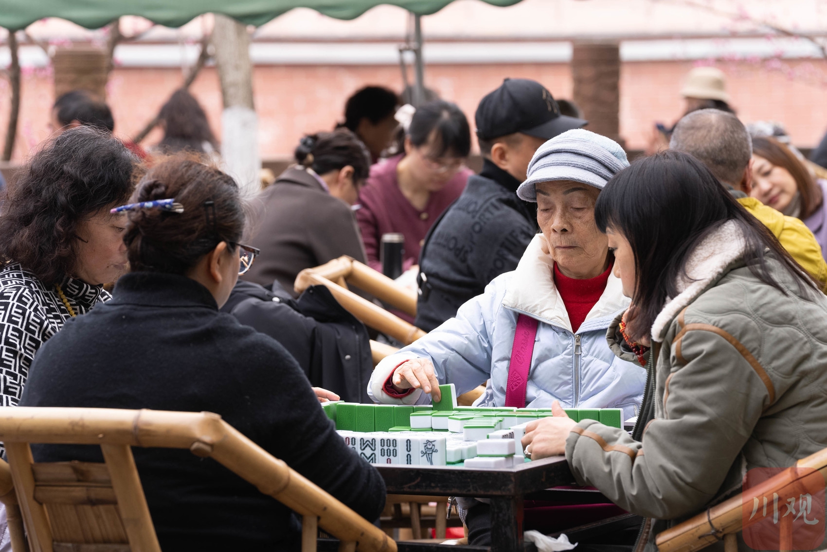 市民们在望江楼公园喝坝坝茶、打麻将。