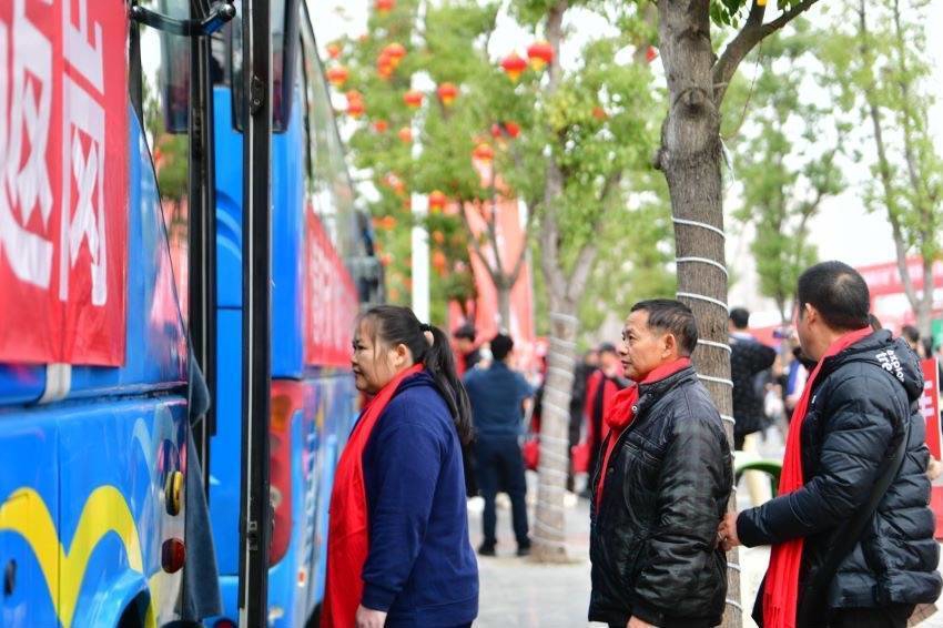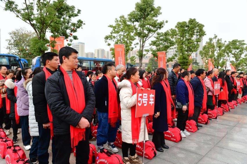 2月20日10时,资阳市民广场2024年四川省“春风行动”暨就业协作专项服务活动现场,5辆张贴着窗花的返岗专车排成一列。212名务工人员戴着红色的围巾,提着印有“资阳市返岗人员大礼包”字样的口袋陆续登车,他们将乘坐大巴车前往成都东站,再转乘高铁前往广东、浙江等地。