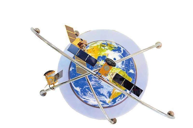 四川傲空航天科技有限公司内的卫星沿轨道绕地球运行模型。 四川日报全媒体记者 李志强 摄