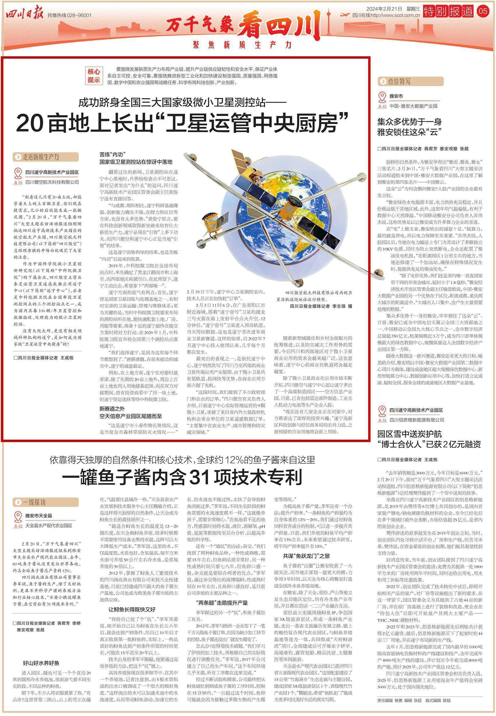“别看这儿只有20亩土地,却能管着天上的上百颗卫星。你们现在提需求,几小时后就能生成一张概况图。”2月20日,“万千气象看四川”大型主题采访活动报道组刚刚抵达四川遂宁高新技术产业园区的航空航天产业园,四川傲空航天科技有限公司(以下简称“四川傲空”)总经理唐骐的开场白就吸引了大家的注意。