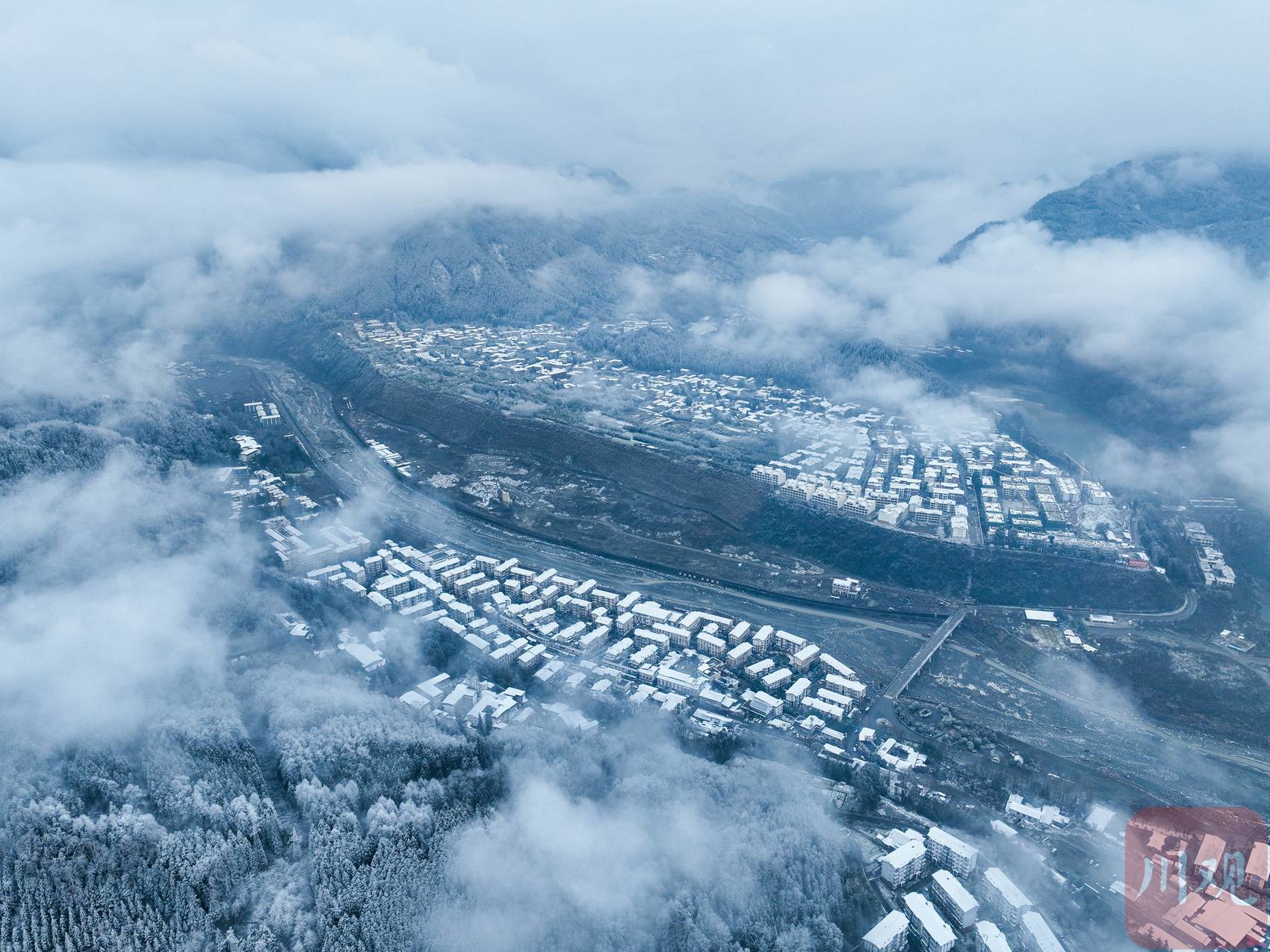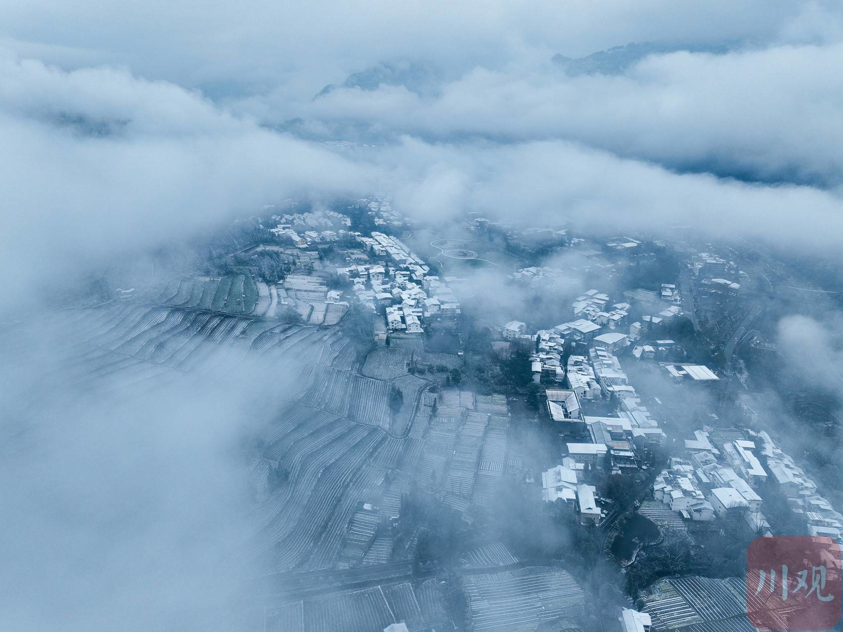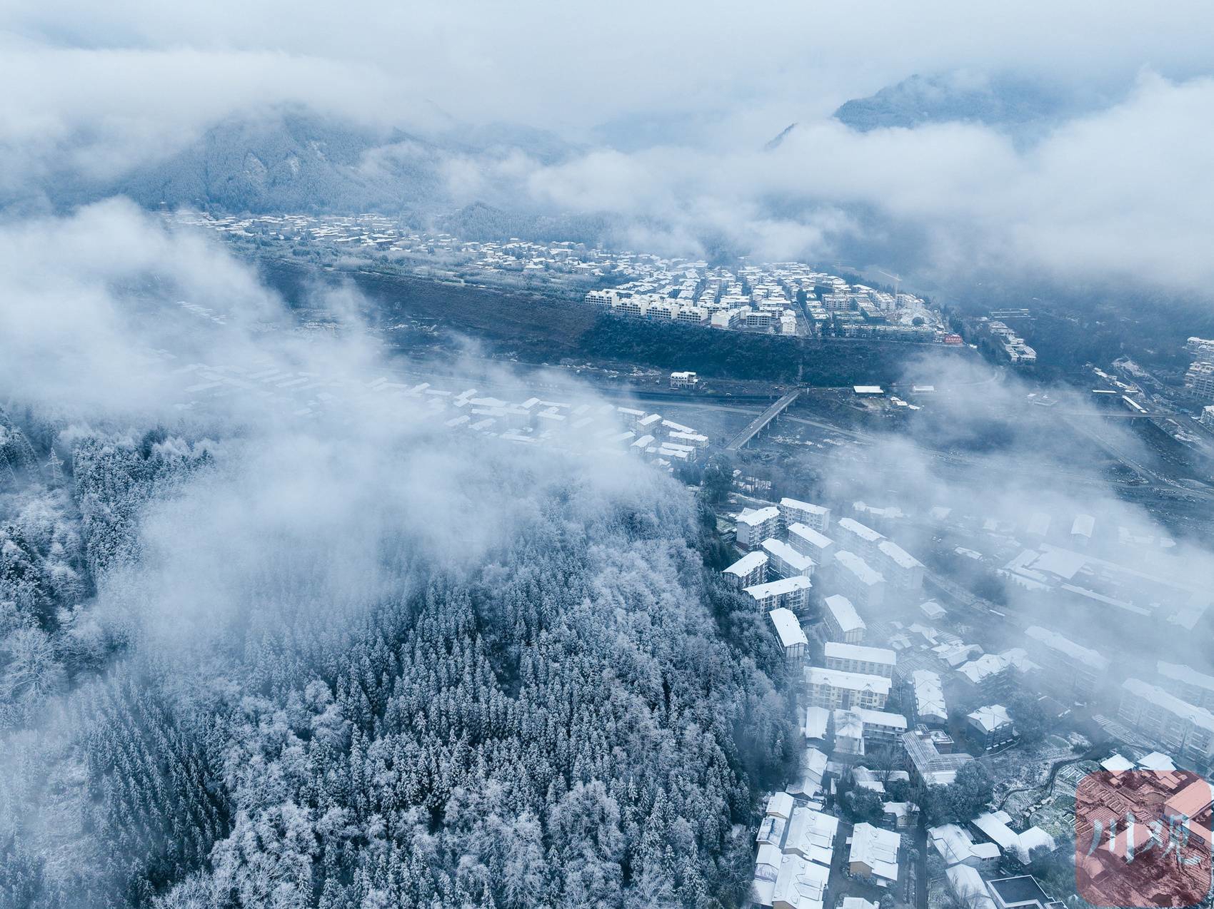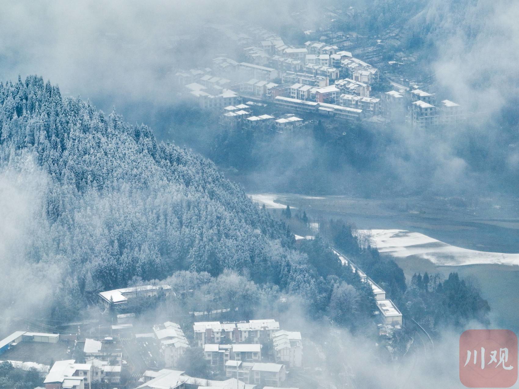 近日,气温骤降,四川多地降下龙年首场春雪。2月23日,彭州龙门山、湔江河谷已被落雪覆盖成一片银装素裹的世界,从空中俯瞰,薄雾弥漫,松柏凝霜,山峦连绵起伏,村庄和街道悠然静谧,恍若一幅水墨长卷。