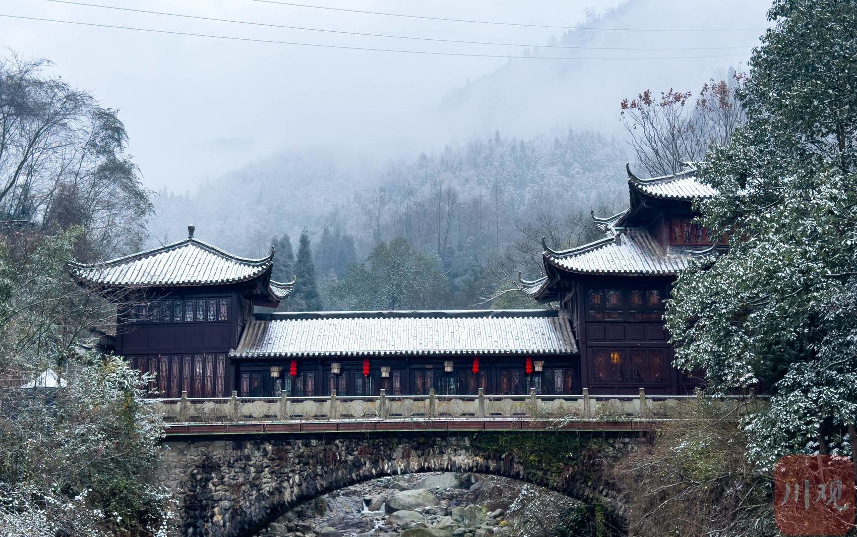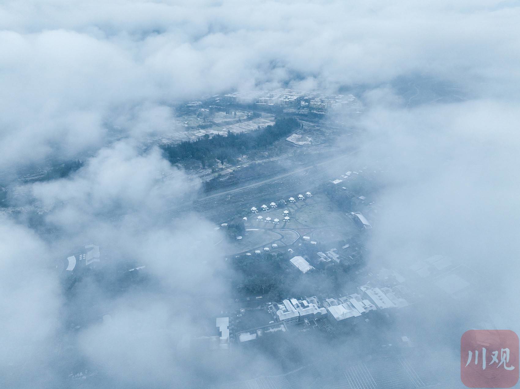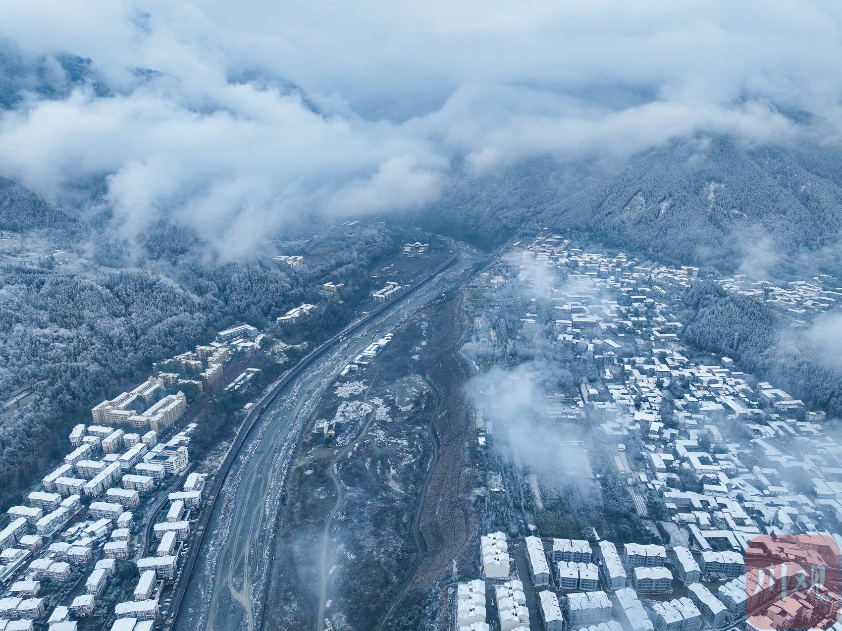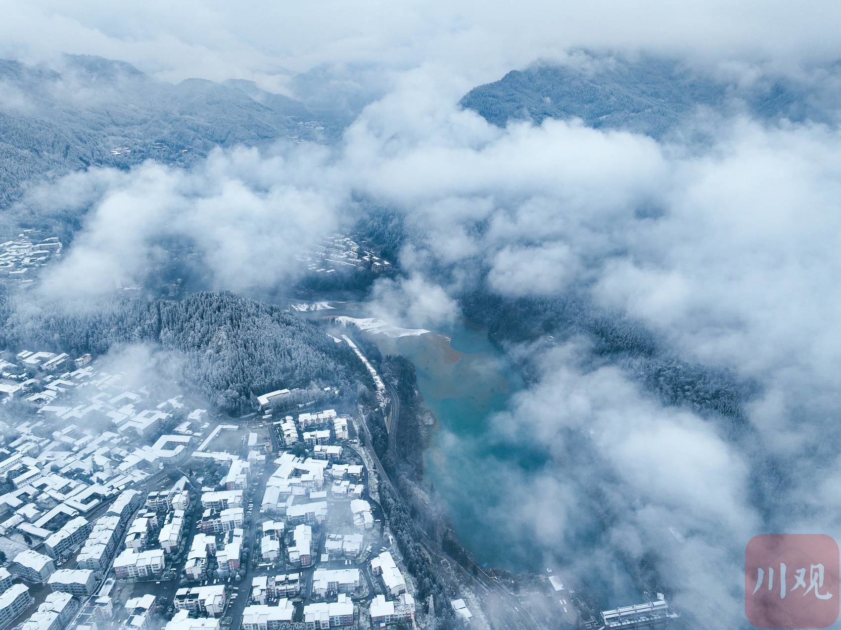 近日,气温骤降,四川多地降下龙年首场春雪。2月23日,彭州龙门山、湔江河谷已被落雪覆盖成一片银装素裹的世界,从空中俯瞰,薄雾弥漫,松柏凝霜,山峦连绵起伏,村庄和街道悠然静谧,恍若一幅水墨长卷。