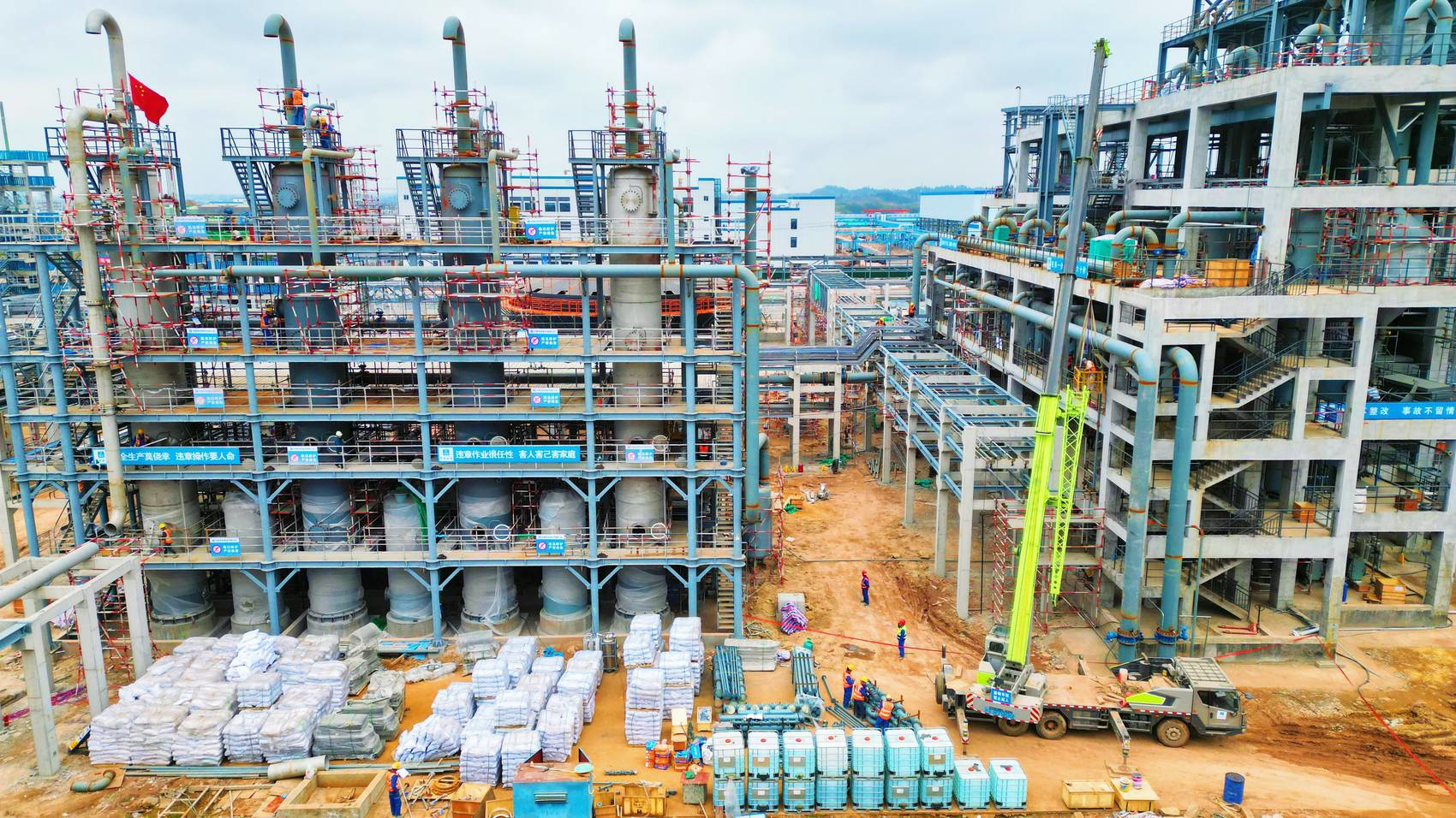 记者看见,现场36个单体建筑已全部完成主体建设,乙炔生产装置、废酸处理装置、炭黑车间等设备已安装到位。项目服务专员邓远彬介绍,为了推进项目进度,他们不断优化施工环节,科学调配施工力量。不仅协调增加人手、机械设备投入,还推行网格化作业管理、一对一服务专员等措施。“为了赶进度,我们春节期间也没放假,留有100余人按照两班倒赶进度。”