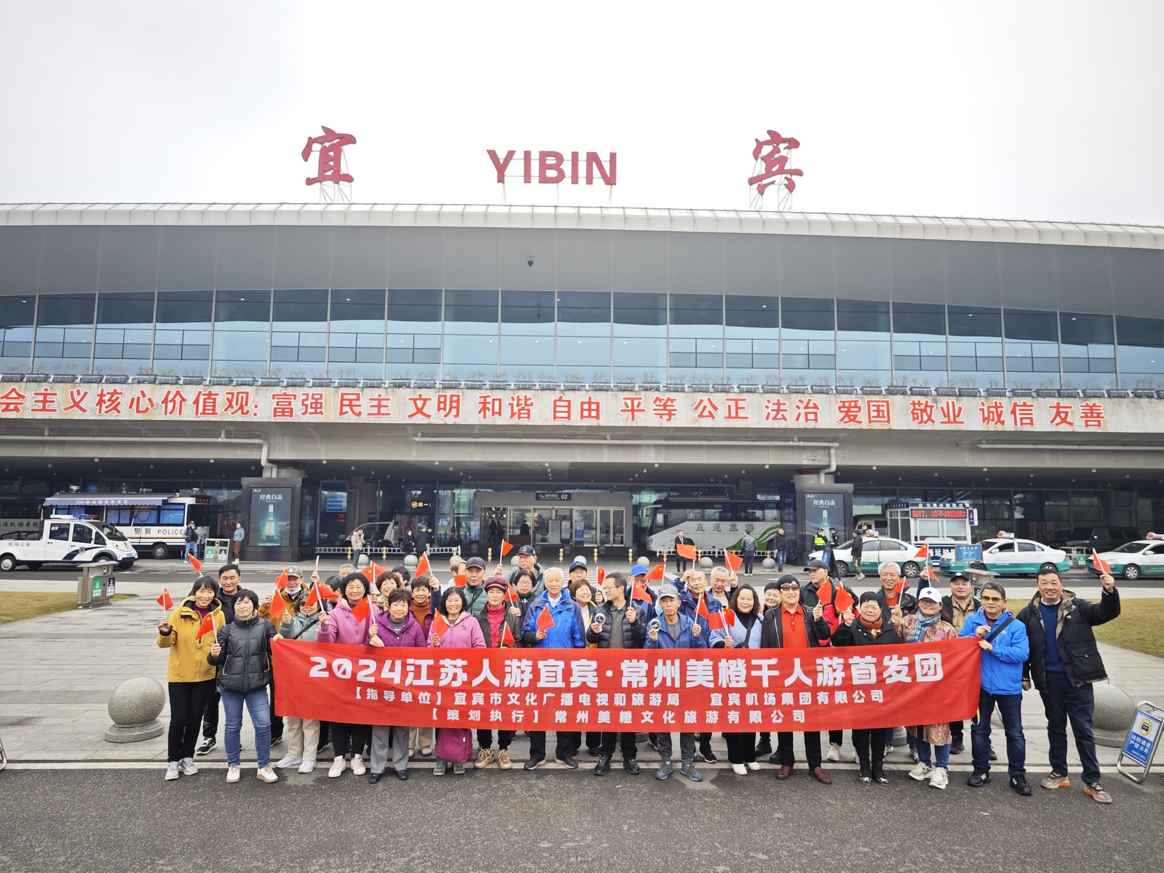 五粮液、蜀南竹海、兴文石海、李庄古镇、冠英古街、僰道文化……在宜宾这片文旅热土上,早已盛名在外,正在成为宜宾旅游通道上的文旅新坐标。3月3日早上10点半,“2024江苏人游宜宾·常州美橙千人游首发团”抵达宜宾五粮液机场。