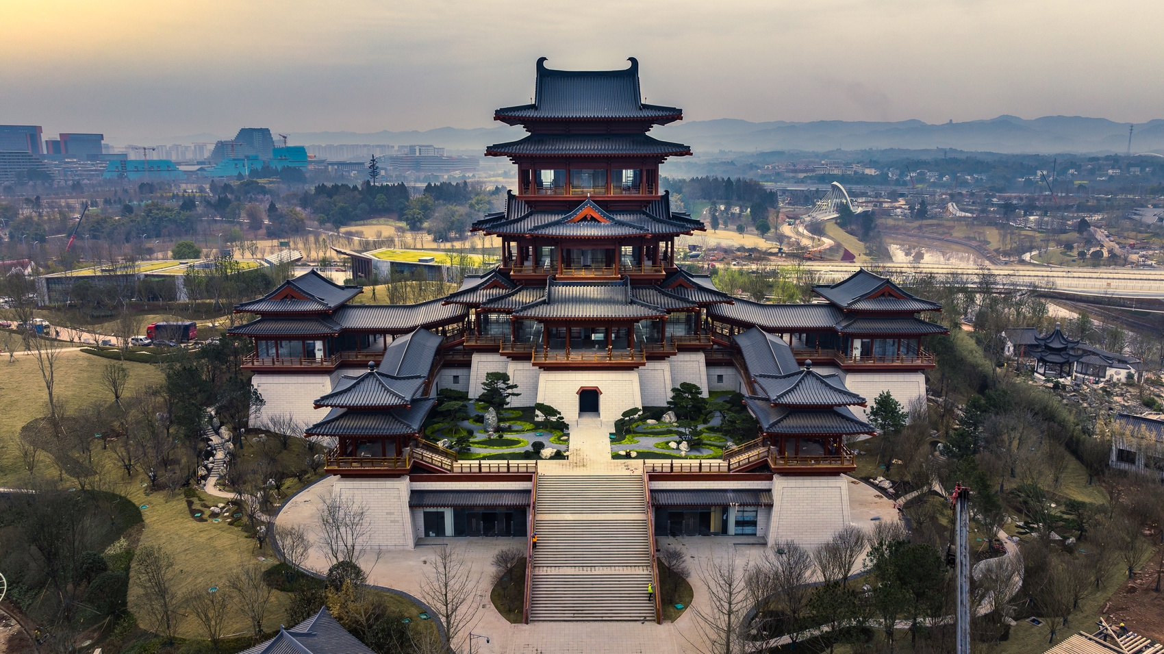 在散花楼上极目眺望,整个主会场一览无余,再望远一些,成都东部新区主要城区风貌也尽在眼底。散花楼作为主会场最高建筑,将在50天后,成为游客们观景的绝佳地点。