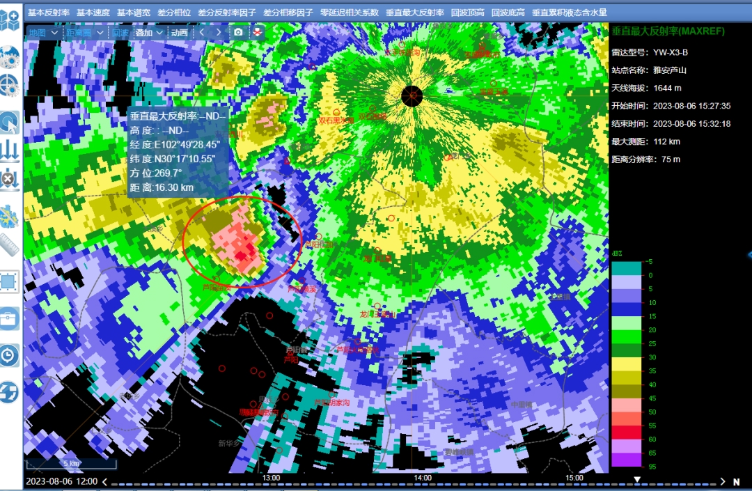 2023年8月6日,雅安市芦山县出现暴雨天气过程,最大1小时降雨为芦山县宝盛站88.5毫米。受强降雨影响,芦阳街道西川河大岩腔段、白虎鹰沟暴发山洪。芦山县水利局利用试点建设的测雨雷达监测降雨情况,精准靶向预警沟道上游山洪灾害,提前转移白虎鹰沟等沟道涉水游玩群众1000余人。
