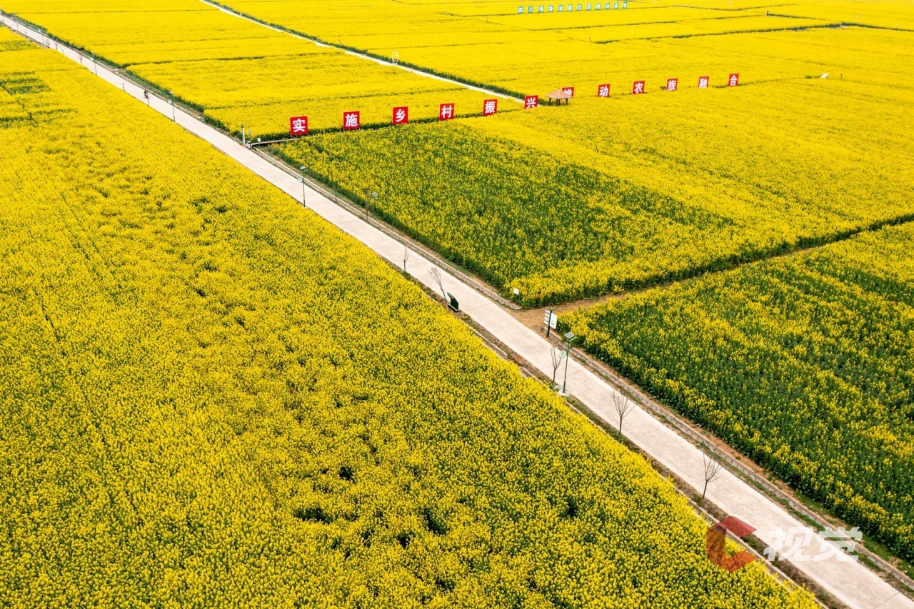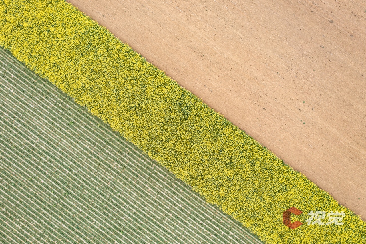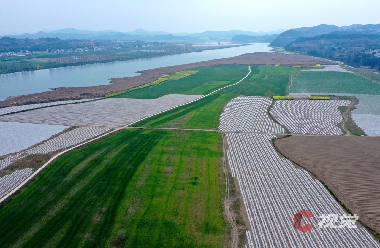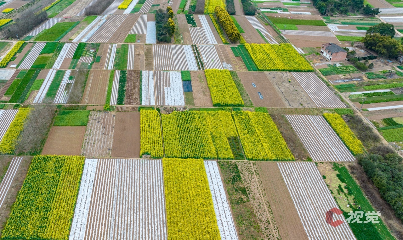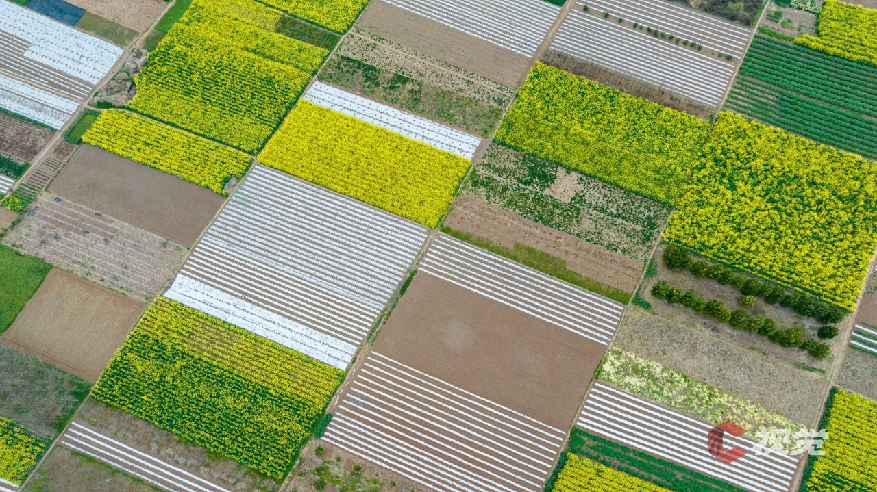 在资阳市临空经济区董家坝,油菜花、大棚与农田纵横交错,勾勒出一幅田园“调色盘”春景图。