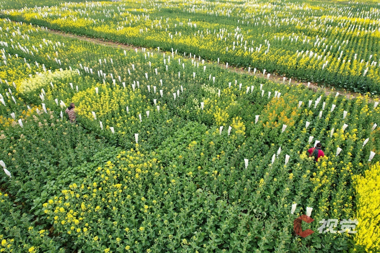 在绵阳游仙区新桥镇的大片油菜田里,为了保持种子的纯度,一株株油菜花被白色条形育种袋套着,工作人员正在对其进行养护。