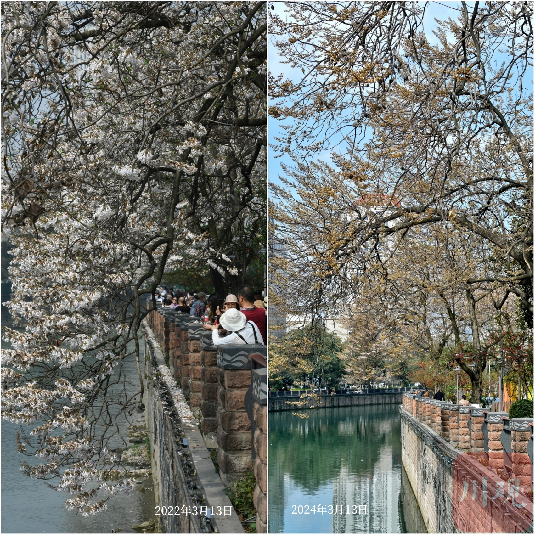 同样是这个时节,3月13日,家住北门的赖女士背起摄影包乘地铁赶来,眼前的景象让她没有料到,几乎所有的泡桐树都还没有开花,紧包的花蕾枯黄。“来早了?怎么没有开花呢?”“前年这个时候花早开了,拍照的人多得很,我今天还是专门赶过来的,生怕错过花期。”“看样子拍泡桐花要到月底去了。”赖女士说。