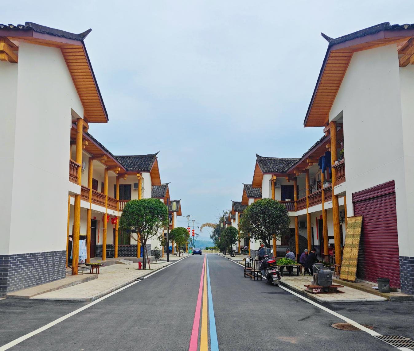 走进改造后的金安新村,干净宽敞的沥青路通到新村房屋门口,道路中间的彩虹标线格外亮眼,白墙灰瓦的房屋庭院、古朴的原木建筑支柱,无不展现出新村别具特色的川东民宿特色。