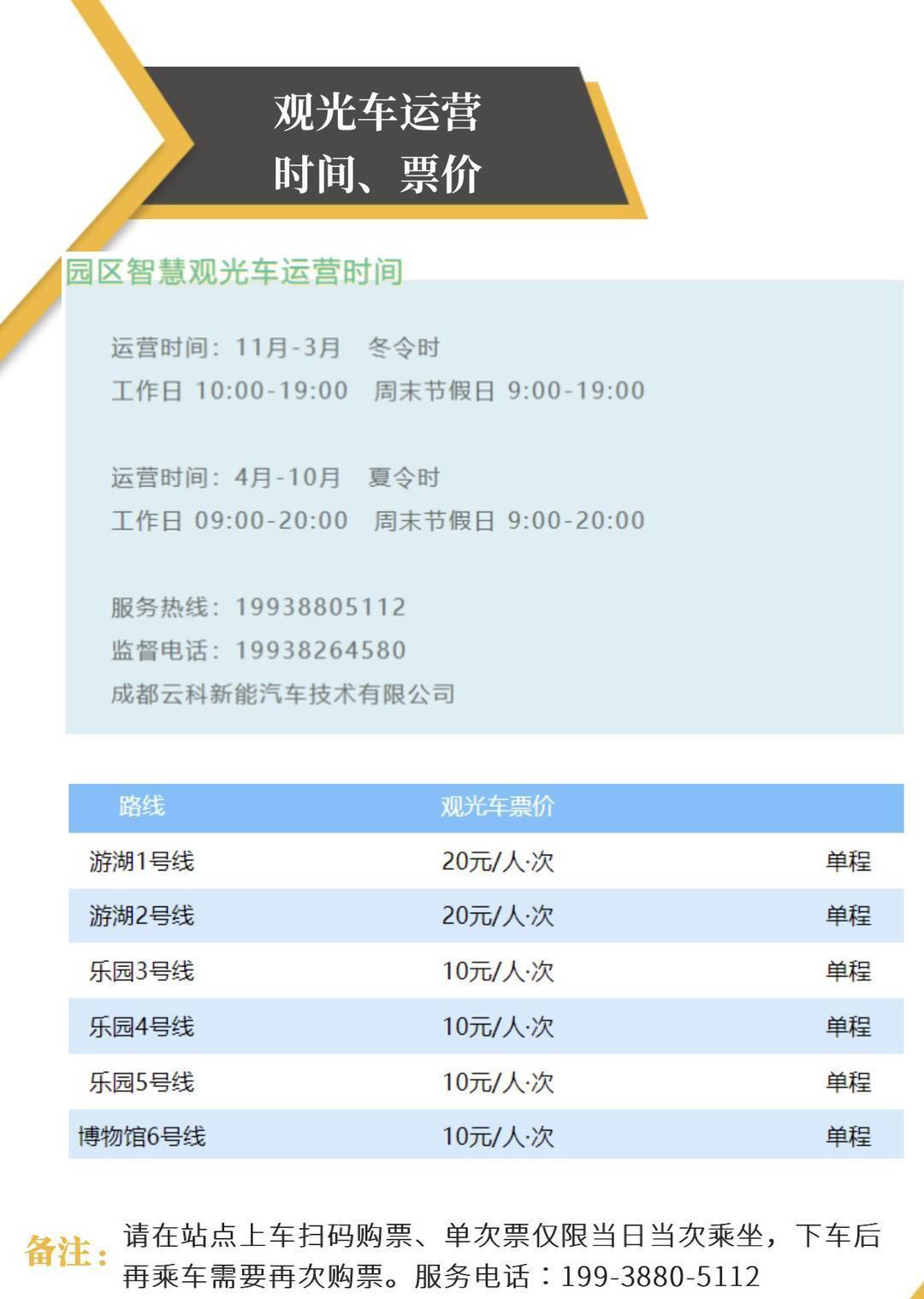 此外,园区运行着智慧观光车,根据不同路线有10元/人次、20元/人次的单程收费标注,仅限当日当次乘坐。
