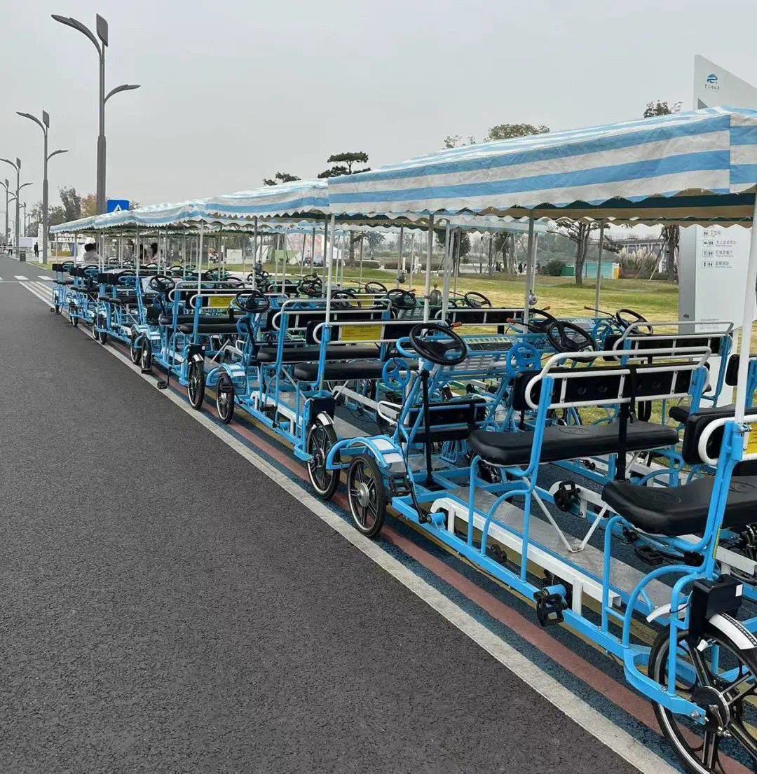 记者注意到,园区提供的交通工具包含了双人自行车、亲子自行车、观光电动车等。其中,观光电动车起租价为60元/30分钟,自行车起租价为40元/40分钟。游客中心的工作人员告诉记者:“大家选择的车辆不同、游玩时间不同,最终消费金额是不一样的,相当于骑自行车的话最低消费是40元。”