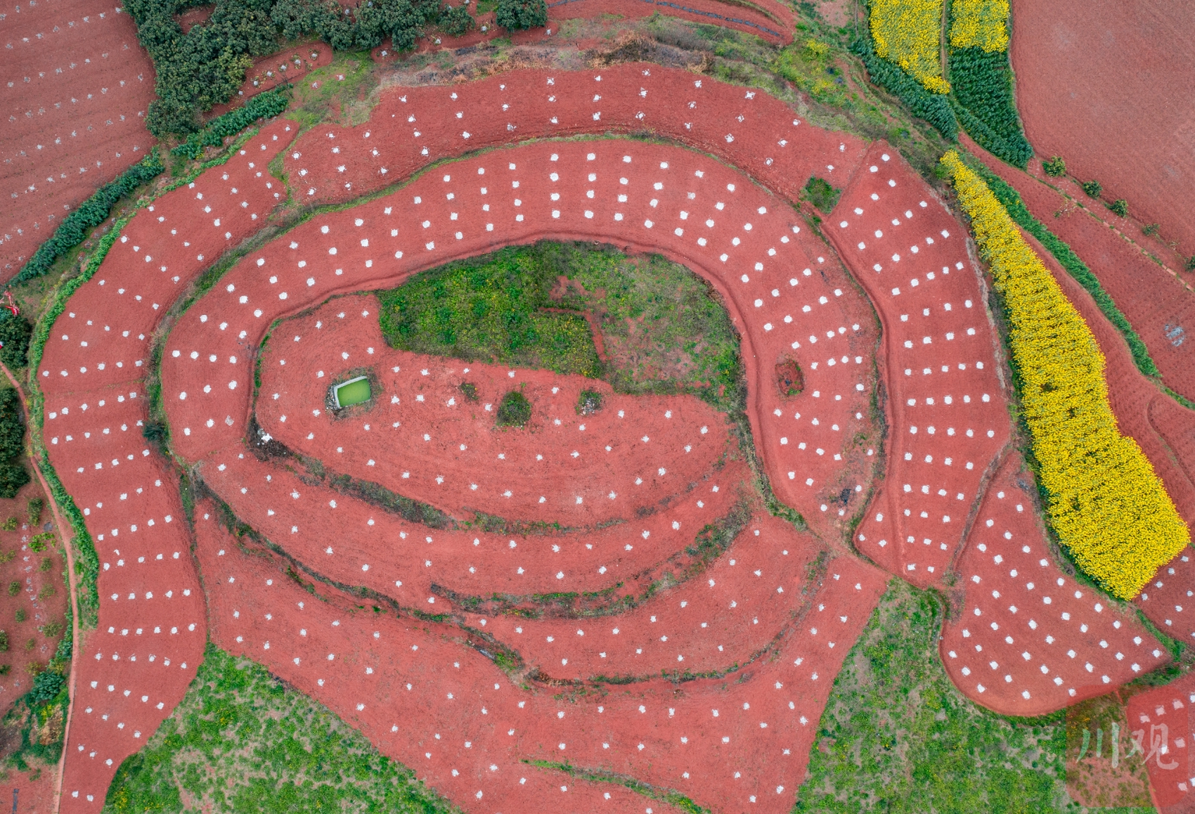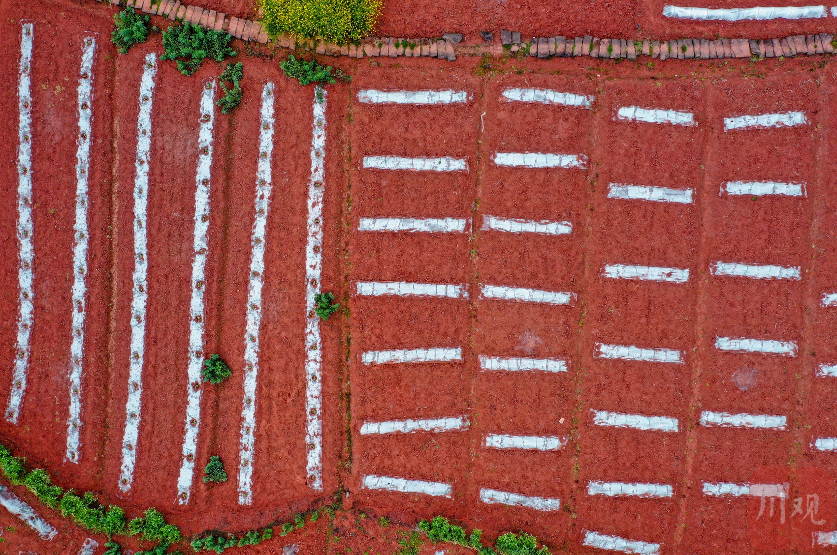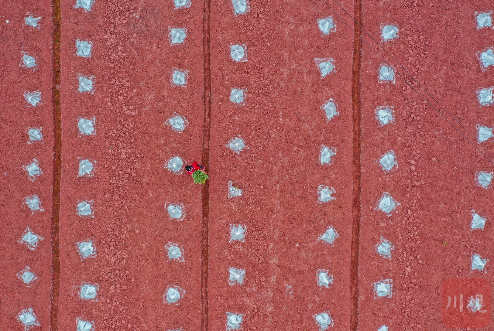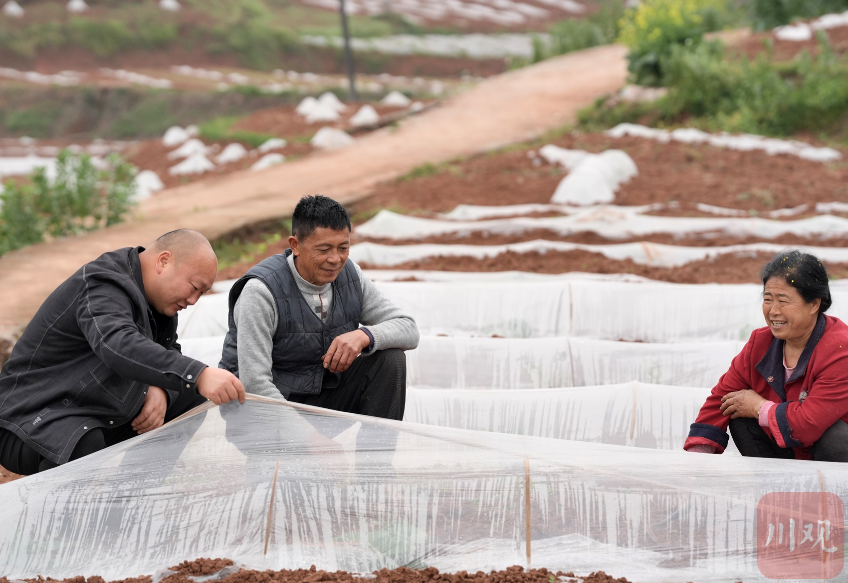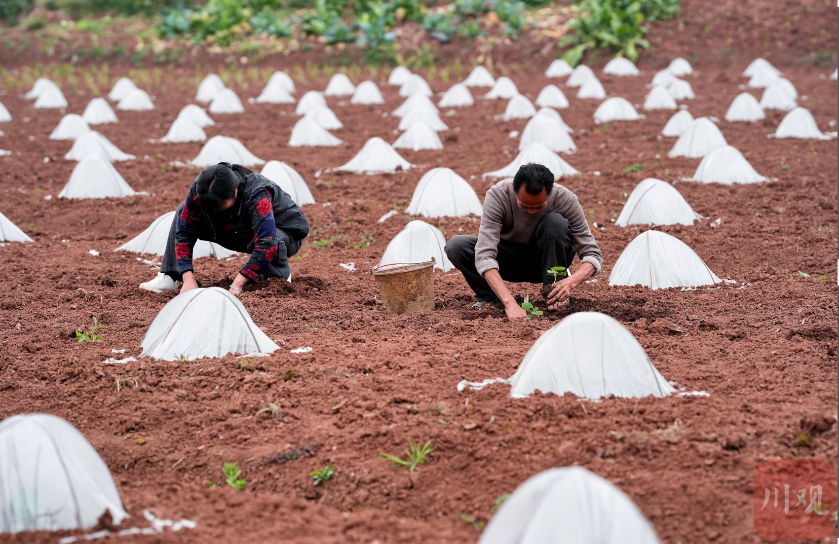 3月13日,宜宾市江安县迎安镇凤鸣村,南瓜种植户在田间移栽南瓜苗,大家种苗、浇水、盖膜等,覆膜后的南瓜苗整齐排列在土地中,犹如闪跃跳动的音符。