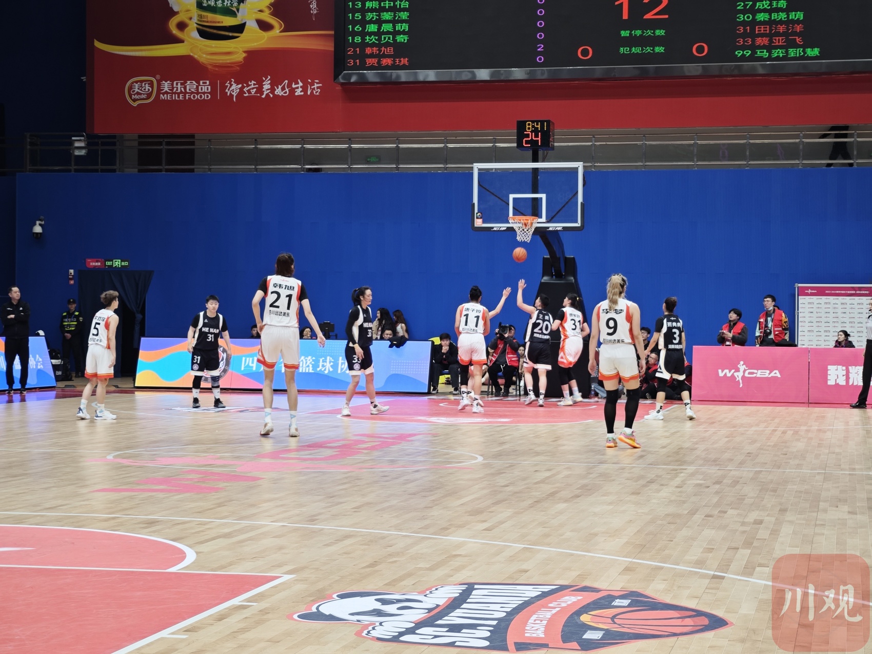 本场比赛对于四川女篮来说相当放松,开场前热身的氛围比较活跃。比赛打响后,四川女篮凭借内线高度上的优势,取得了13:2的领先。随后,第一节比赛还剩3分钟时,四川女篮将首发球员全部换下,“五换五”实在少见。球队主力就此得到了休息机会。第一节比赛结束,四川女篮以35:12领先,基本锁定比赛胜局。