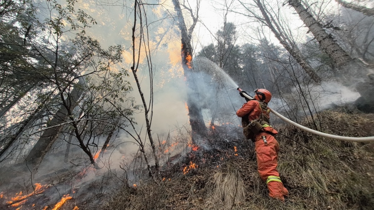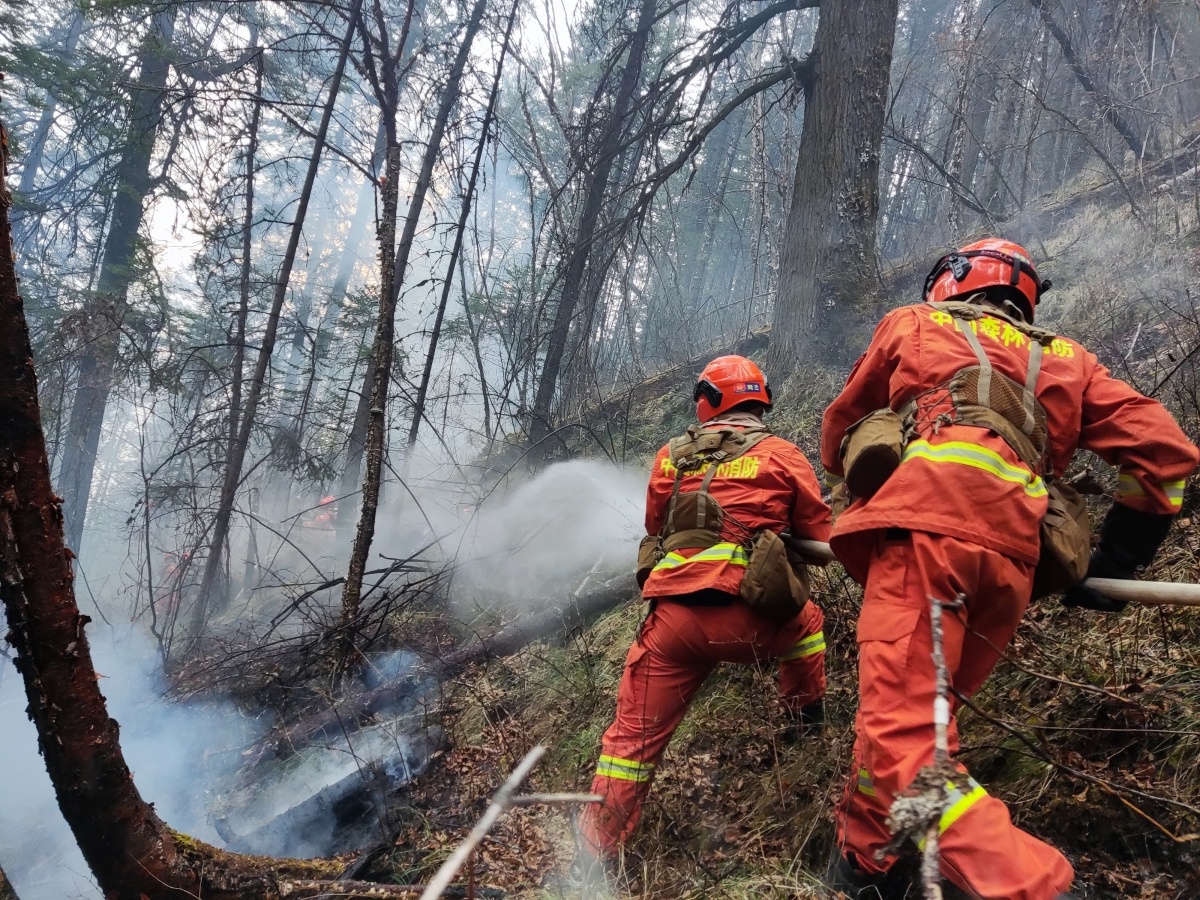 沟坎、碎石、倒木、暗冰、平均海拔3400米的山峰、超过70°的悬崖陡坡……山路崎岖,消防员们常常需要抓握路边树枝和杂草攀爬,一路上还要不停地铺设水带,从溪谷一直延伸到火场附近。