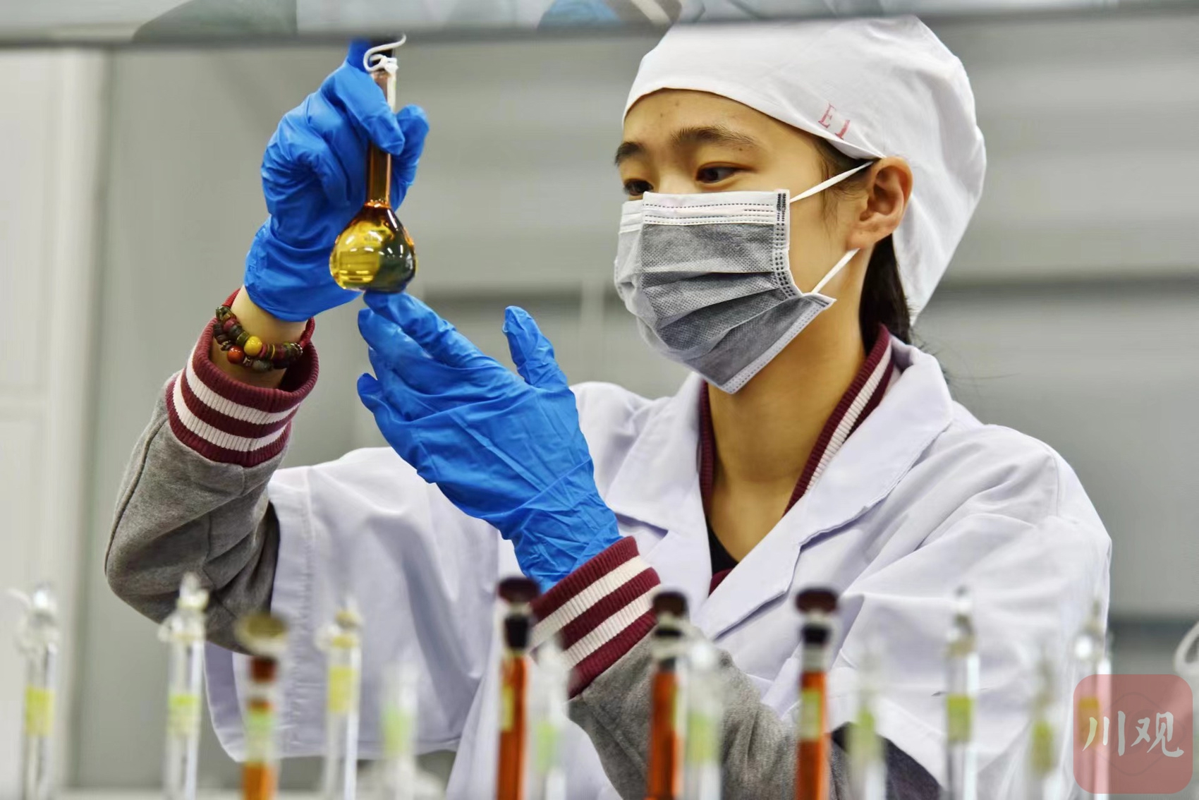 3月19日,在泸州市国家高新区医药产业园的四川科瑞德制药股份有限公司(以下简称:科瑞德)药物研究院制剂研发部实验室内,身穿白色大褂、佩戴防尘口罩的制剂研究人员正在进行某镇痛药物的工艺研究。该实验室也是厅市共建中枢神经系统药物四川省重点实验室主要场所,也是泸州市首个年度考核获“优秀”等次的省级重点实验室。