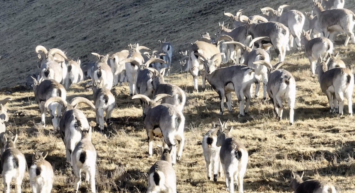 在若尔盖县扎萨格峡谷附近,成群的岩羊悠然自得,时而漫步觅食,时而奔跑嬉戏,时而抬头观望,场面颇为壮观,为春日的若尔盖增添了灵动与活力,生动展现了人与自然和谐共生的美好画面。