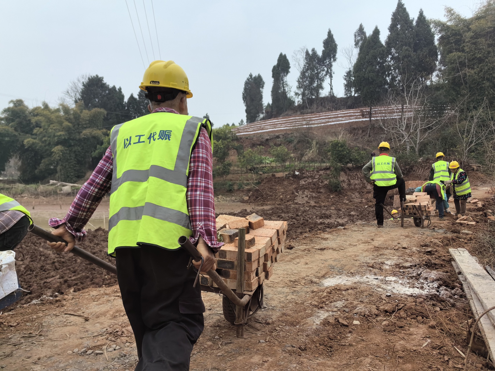 3月18日,内江市资中县孟塘镇白莲村6组的以工代赈项目建设现场,人们各司其职,搬运红砖、搅拌砂浆、砌砖,在大家熟练地配合下,项目建设的山坪塘迎水面已初露雏形。