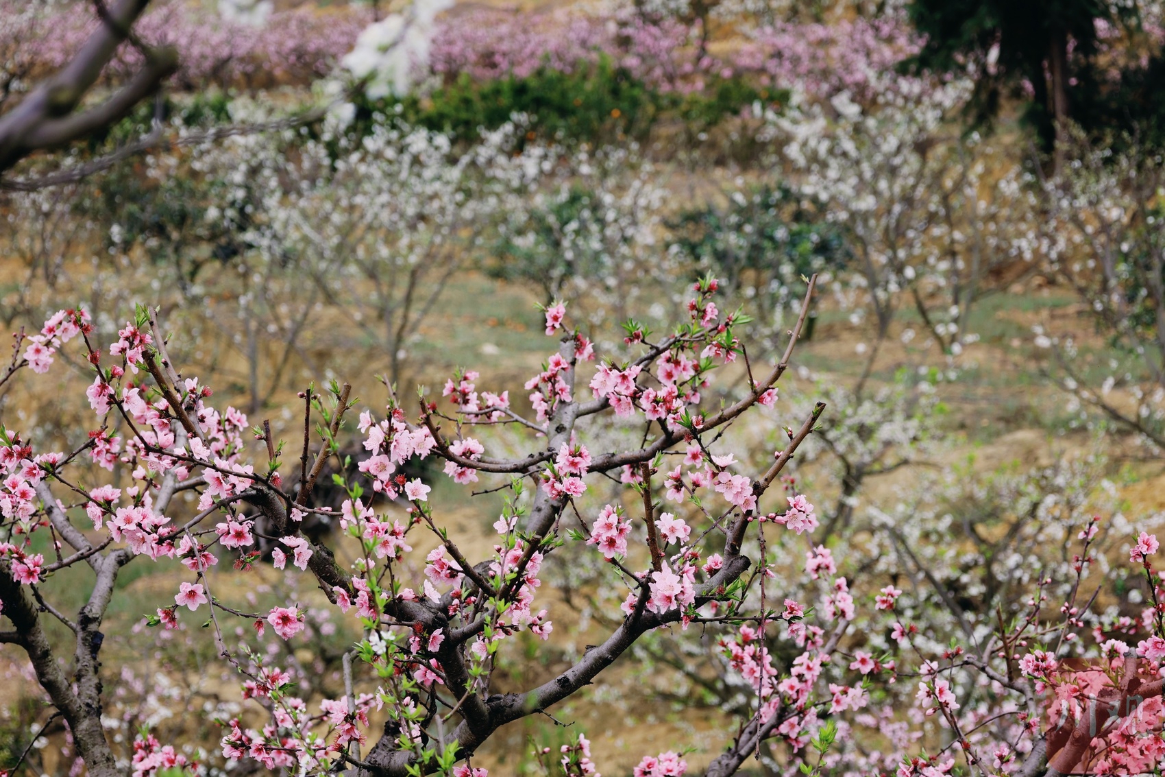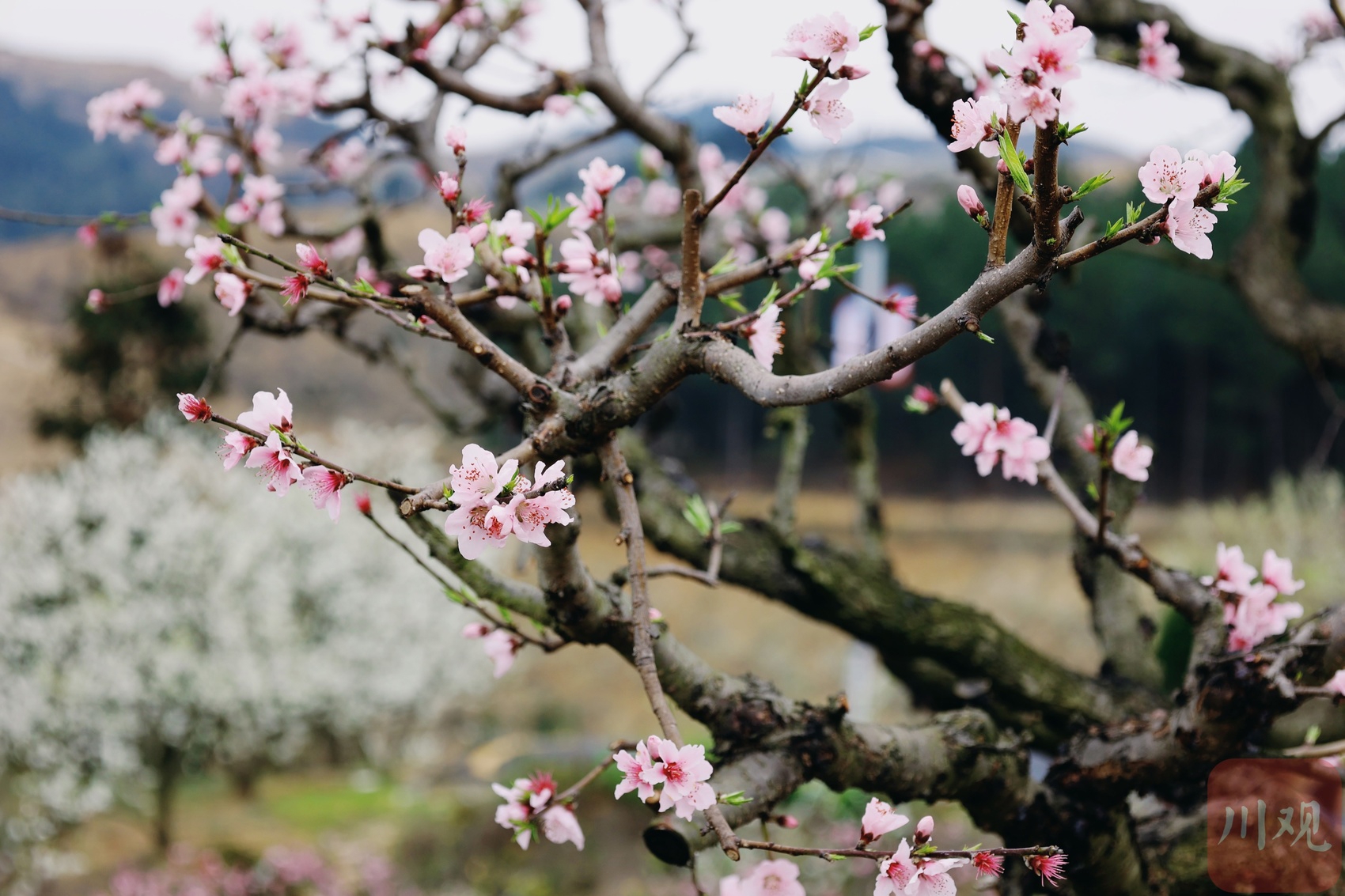 沥青路盘山而上,沿途有粉白相间的李花桃花相伴,春意盎然。跟随李花桃花的脚步,一路进入了叙永县赤水镇双山村,与沿途不同的是,雪白色的花海呈梯形绽放,错落有致,李花下有黄灿灿的油菜花点缀,为初春添上了色彩和暖意。