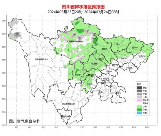 24日白天到晚上,盆地大部阴天有阵雨或雷雨,西部沿山和东北部部分地方有中雨,达州、巴中2市有大雨,个别暴雨;川西高原大部阴天间多云有阵雨(雪),局部中雨(雪),个别大雪,川西高原其余地方多云间阴;凉山州北部多云间阴天有分散阵雨,攀西地区其余地方多云间晴。24日盆地普遍有4—6级偏北风,山口河谷可达7级或以上。