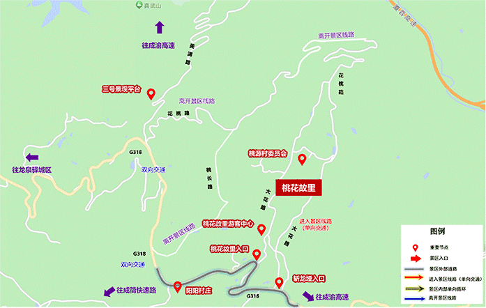 第38届桃花荟已于3月15日开幕,为确保道路交通安全、畅通,桃花荟期间每周六、周日9时至20时,桃花故里景区内部道路实行单向通行。机动车可经318国道桃花故里主入口或318国道斩龙垭路口进入景区;景区内部环线道路与桃源村委会门前道路实行“逆时针单向”通行;返程车辆统一经花桃路、桃长路离开。公安机关交通管理部门还将根据道路交通流量适时调整景区内部道路交通组织。