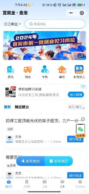 记者从宜宾市数字经济发展局获悉,目前,宜宾首个AI零工推荐算法系统已在宜宾市人力资源社会保障局联合鱼泡网打造的宜宾人专属的灵活就业服务平台——“宜就业·鱼泡(微信小程序)”完成部署并上线。