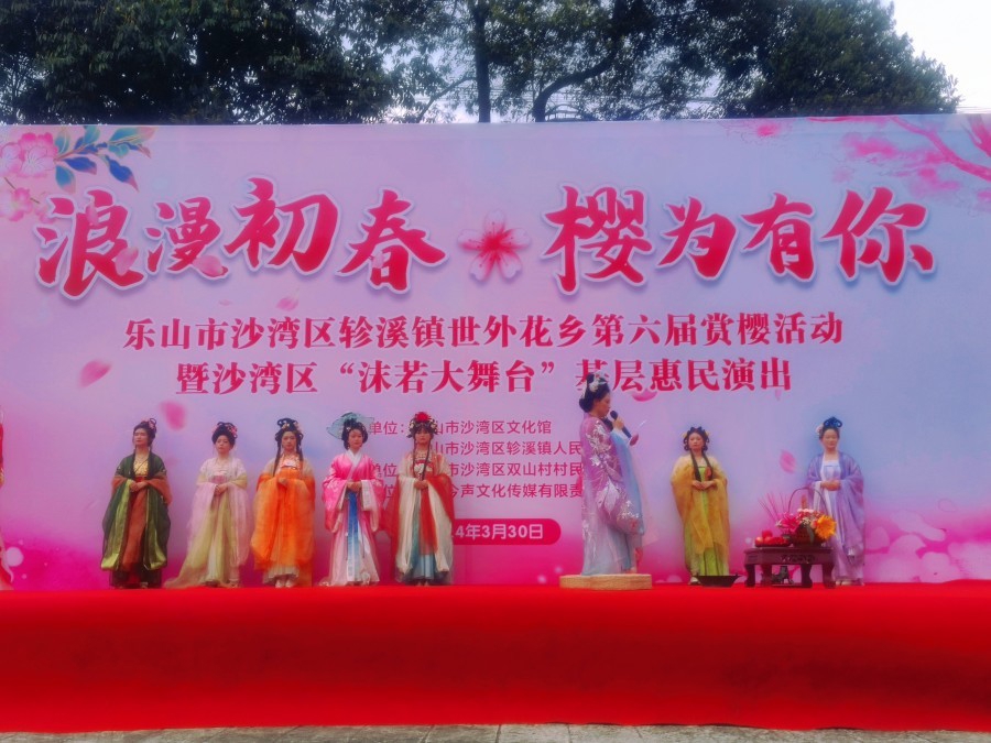 漫山遍野春色浓,万亩樱花齐开放。3月30日,乐山市沙湾区轸溪镇世外花乡第六届赏樱活动暨沙湾区“沫若大舞台”基层惠民演出活动在轸溪镇双山村“世外花乡”广场举行。恰逢周六,不少市民、游客前来观赏樱花,享受春日好时光。