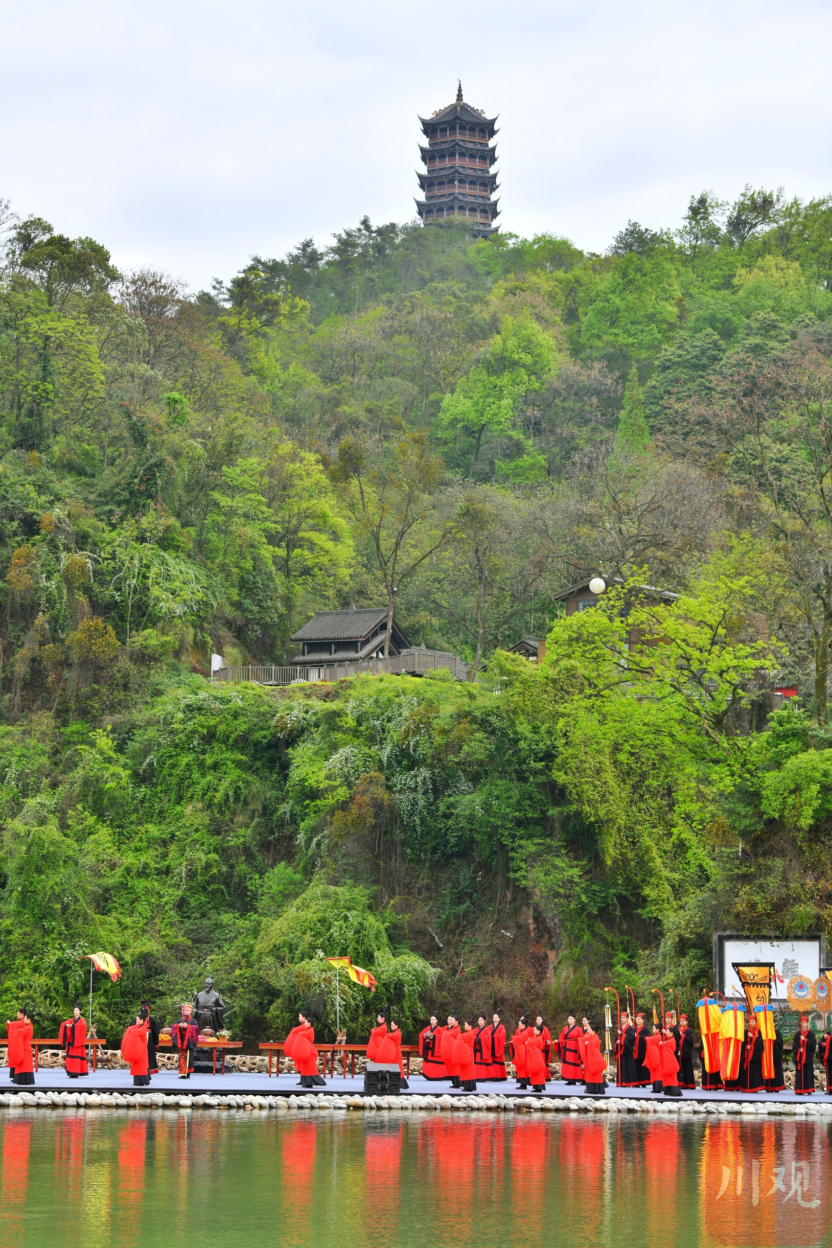 4月4日,2024都江堰放水节在都江堰景区飞沙堰溢洪道盛大启幕。上千名观礼嘉宾着秦朝服饰,学习秦朝礼仪,沉浸式体验智慧的治水文化。