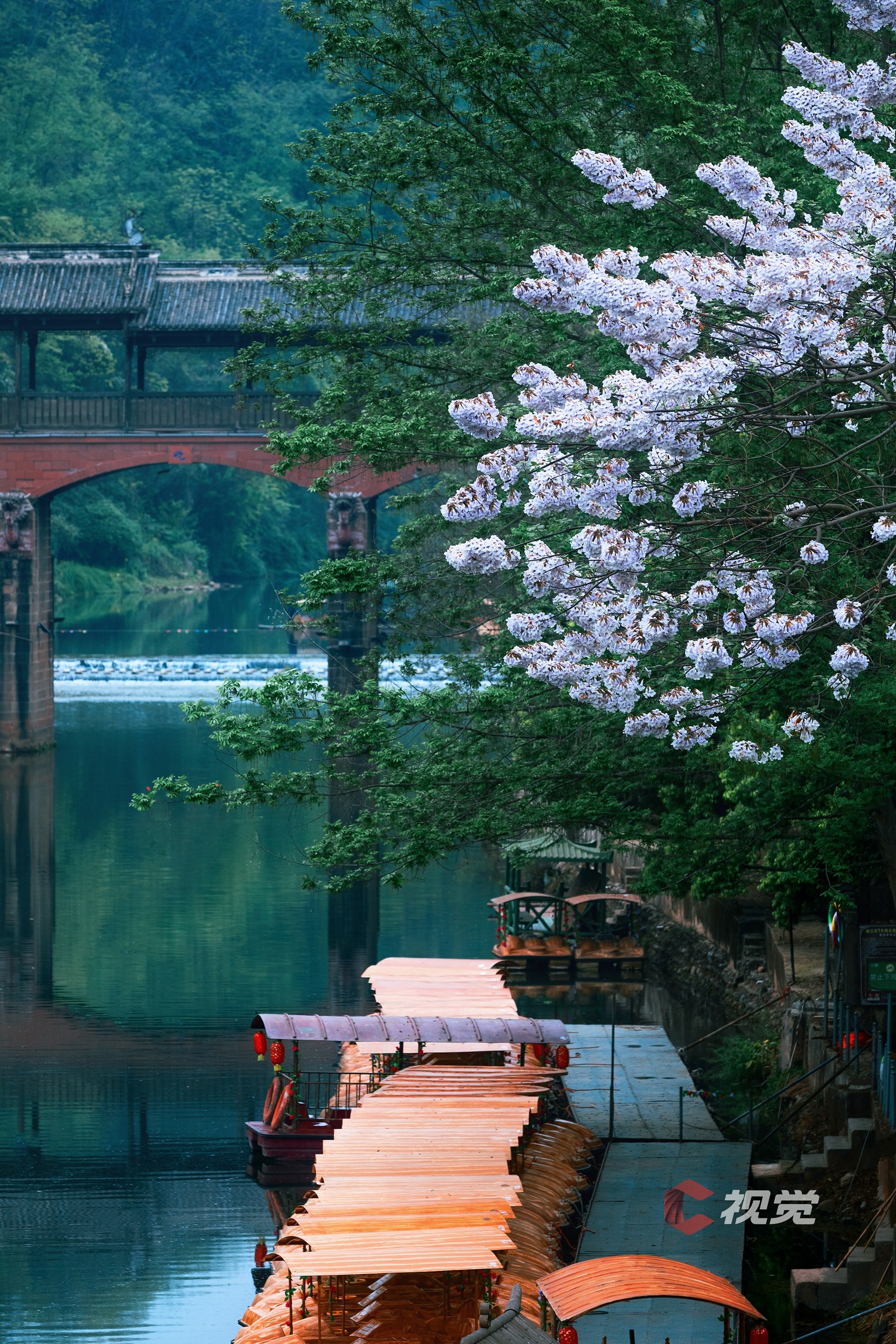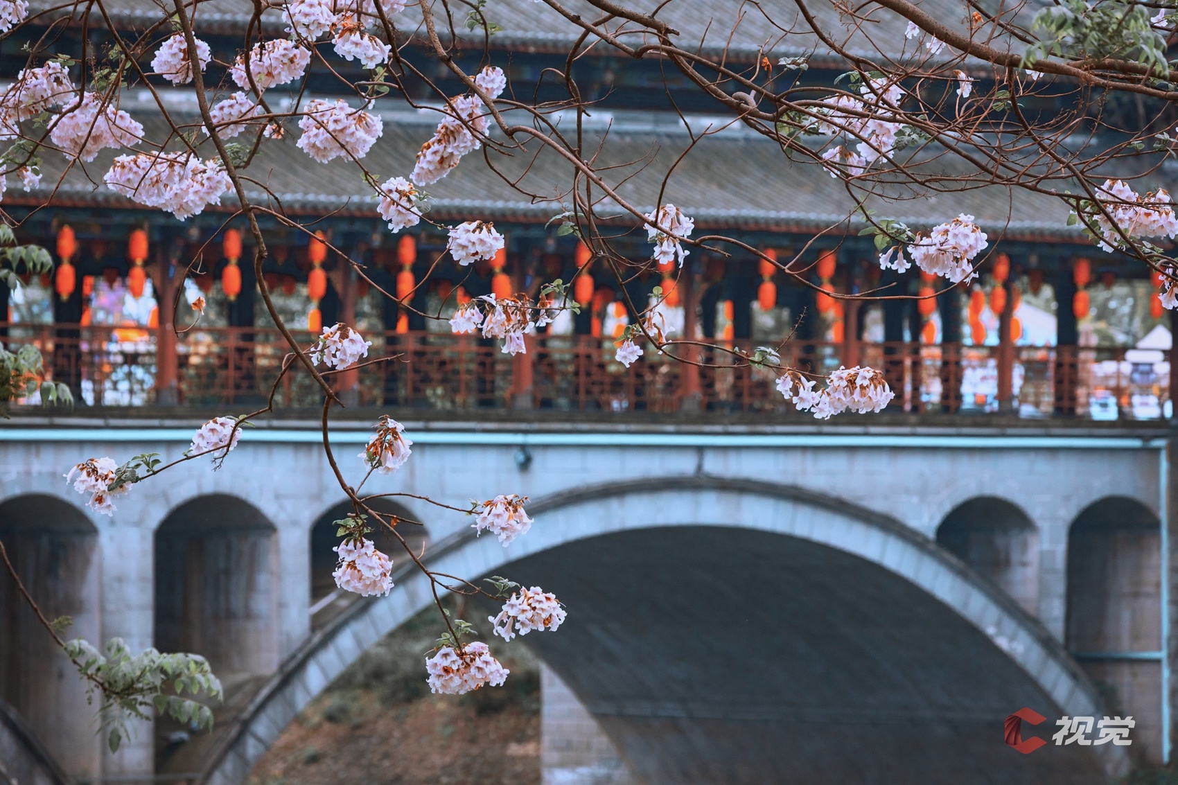 而在街子古镇,另一种“粉紫色浪漫”也在上演,古镇里的泡桐花正值花期,粉紫色花朵满簇绽放,与古街、古桥相映成景,吸引着游客前来,留下这春日美好的记忆。