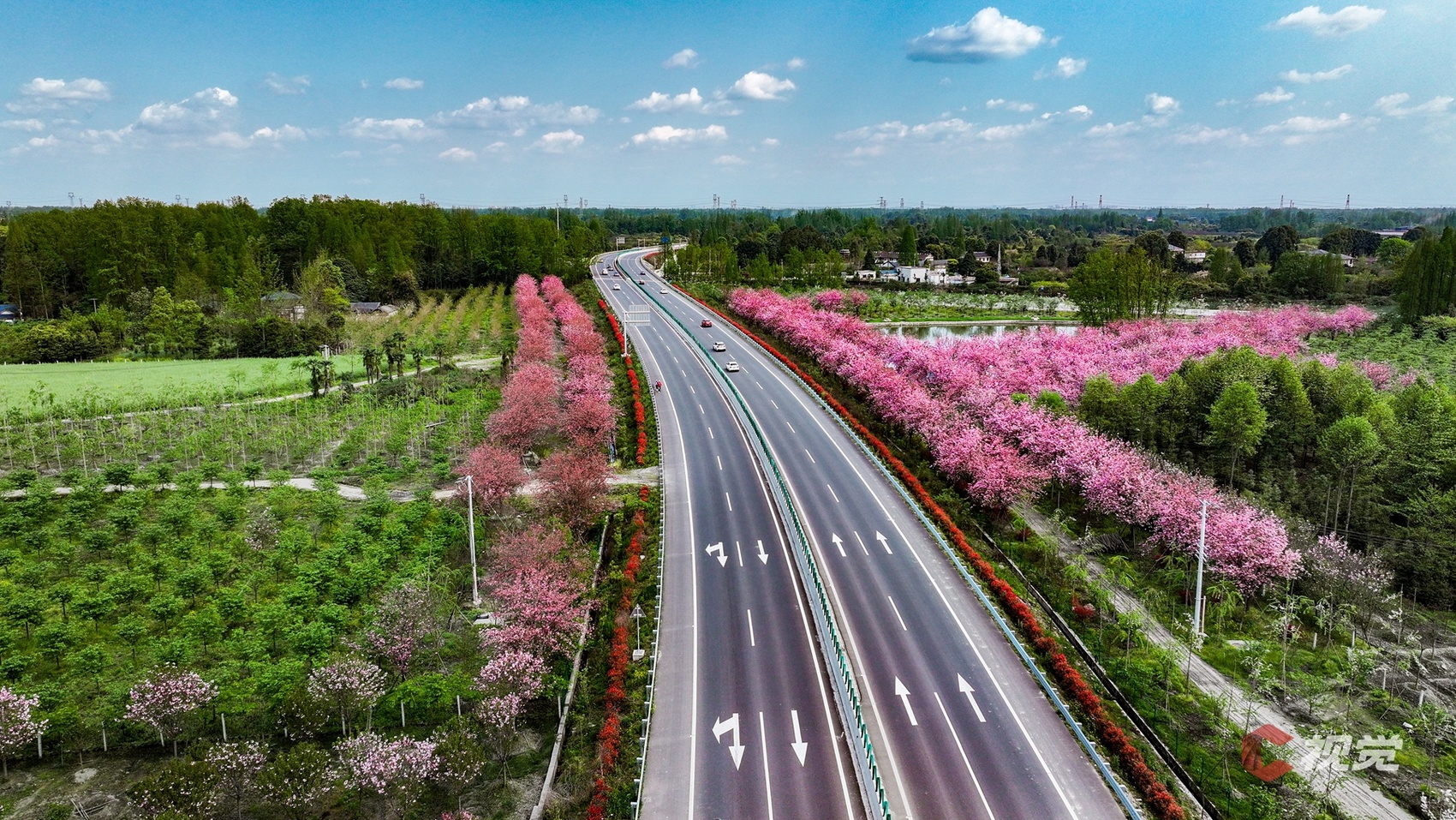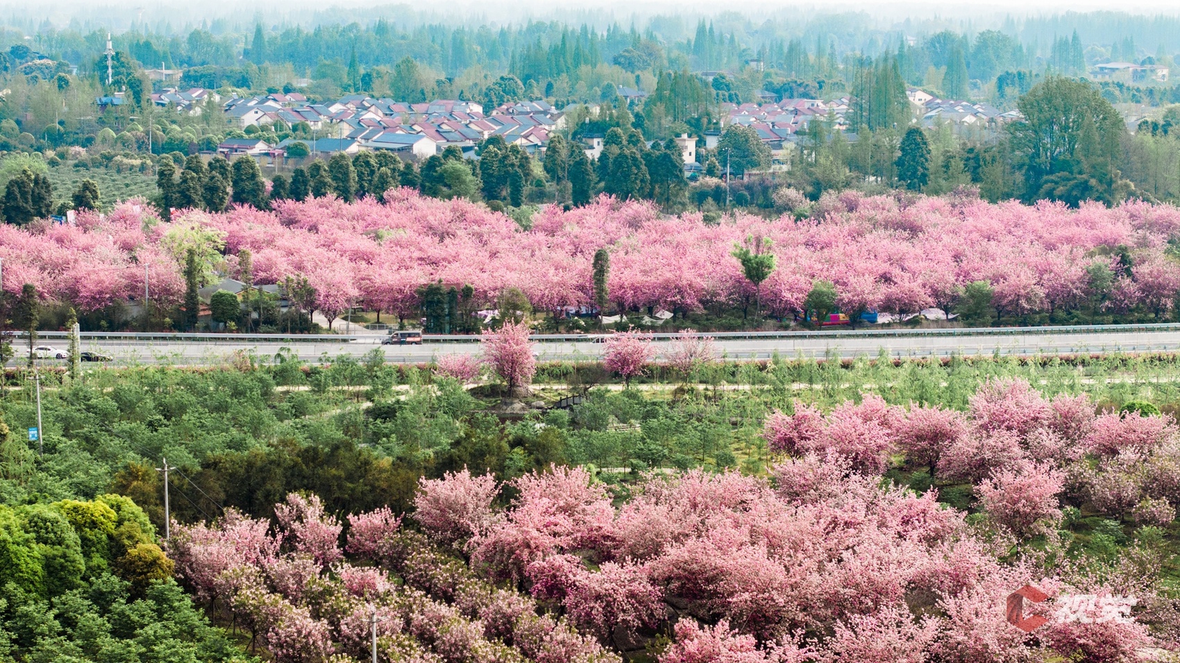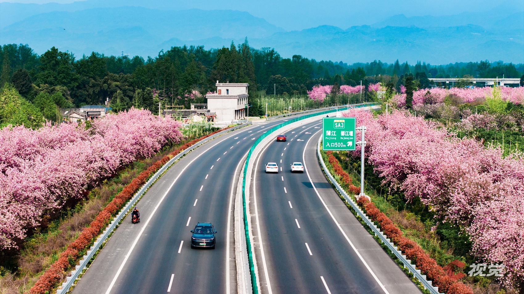 最美人间四月天,在距离崇州街子古镇约4公里的白圣村樱花公园,上万株樱花正在盛放,粉色云霞绵延数里,将临近的中崇路街子连接线道路也妆点得“一路繁花”,在如水墨般的远山映衬下,车在路上行,人在花中游,构成了一幅春日诗画。