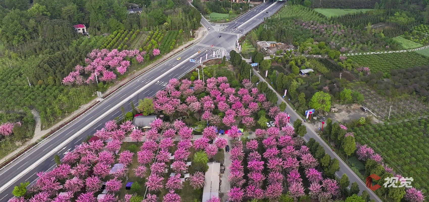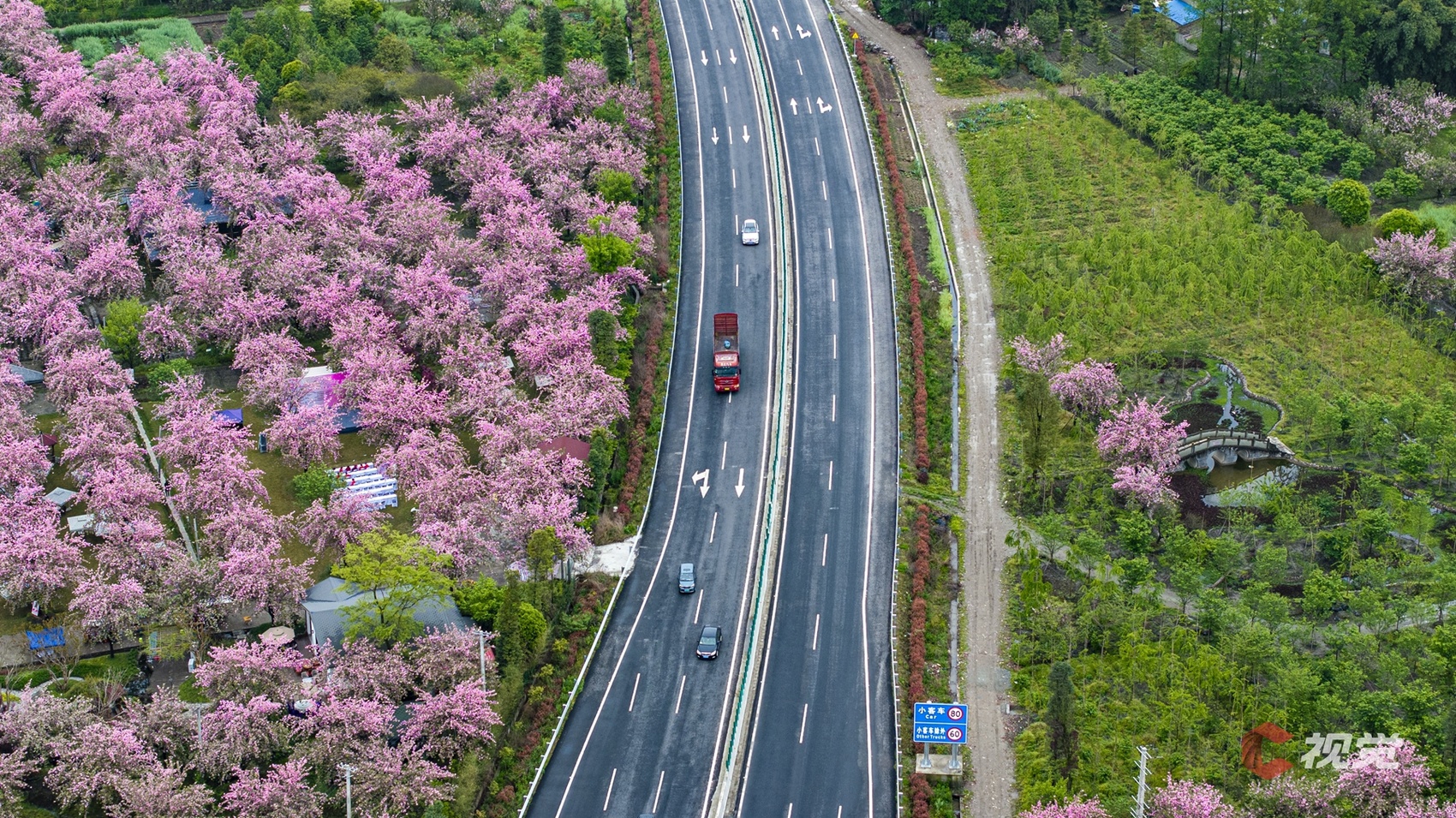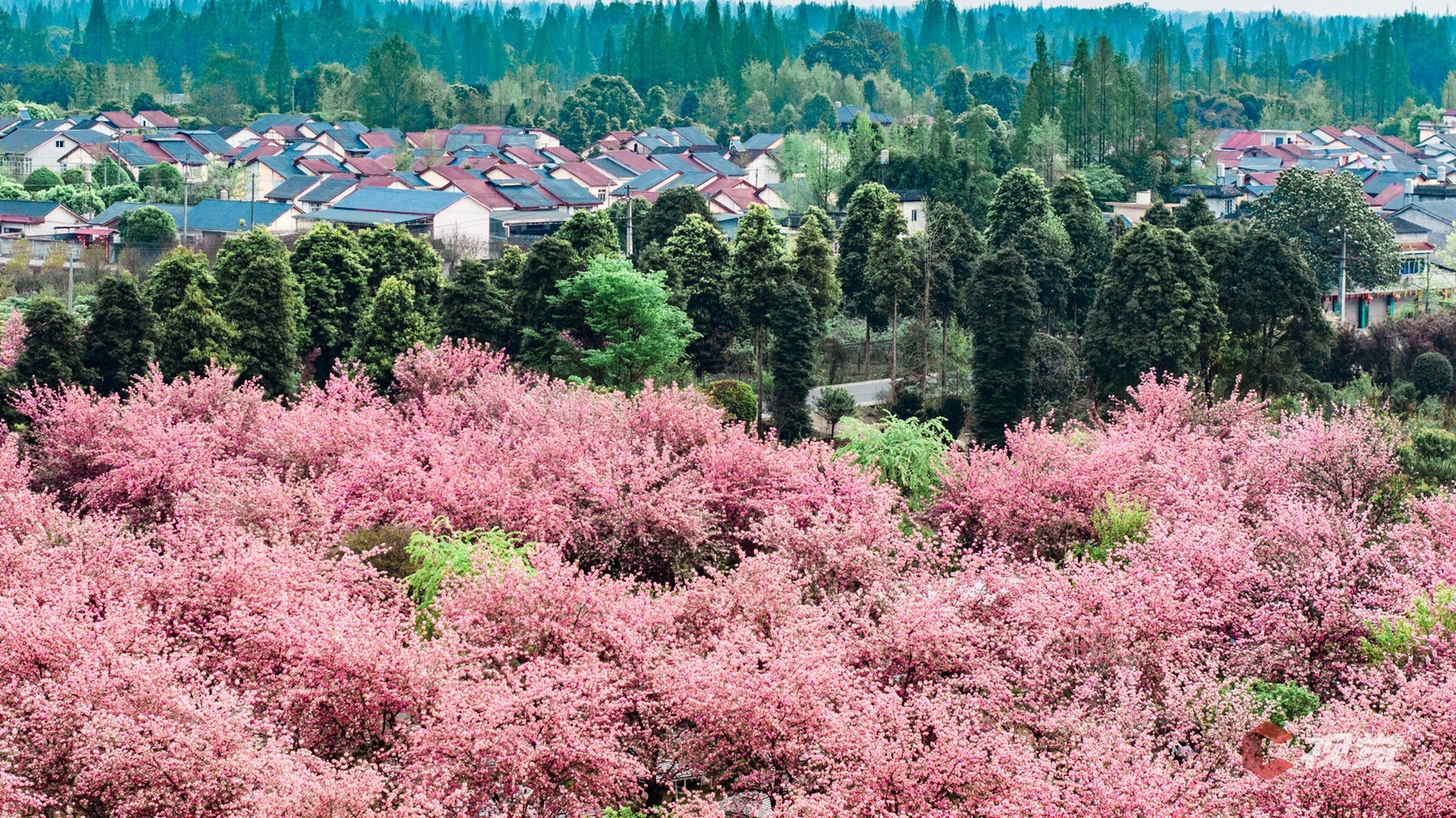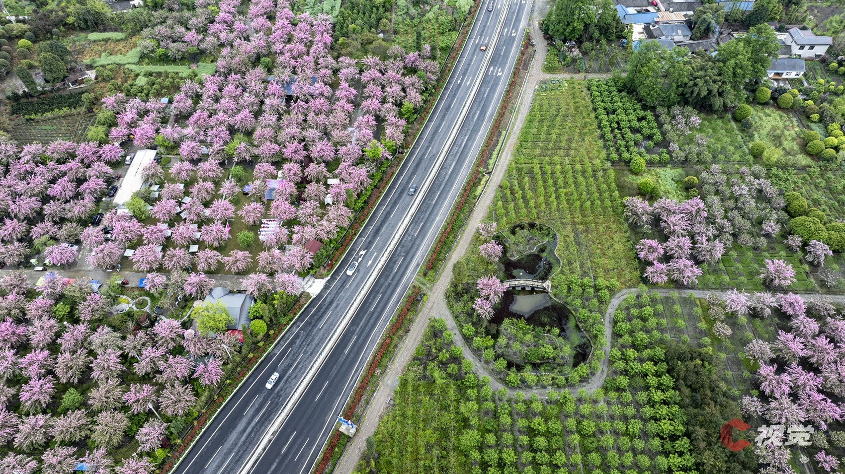 最美人间四月天,在距离崇州街子古镇约4公里的白圣村樱花公园,上万株樱花正在盛放,粉色云霞绵延数里,将临近的中崇路街子连接线道路也妆点得“一路繁花”,在如水墨般的远山映衬下,车在路上行,人在花中游,构成了一幅春日诗画。