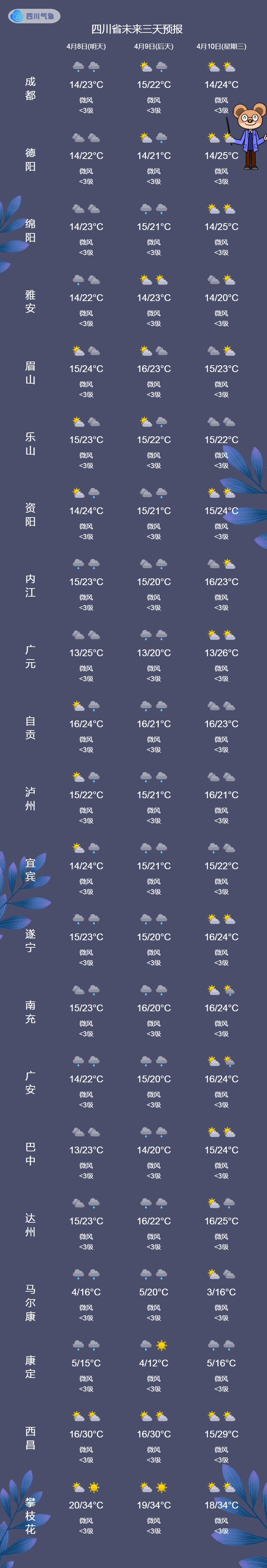 四川省气象台7日下午发布最新天气预报,未来三天,盆地大部阴天间多云,多阵雨或小雨,局部地方有中雨;川西高原大部和凉山州东北部多阵性降水,局部中雪(雨),个别地方大到暴雪。